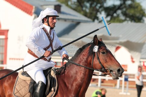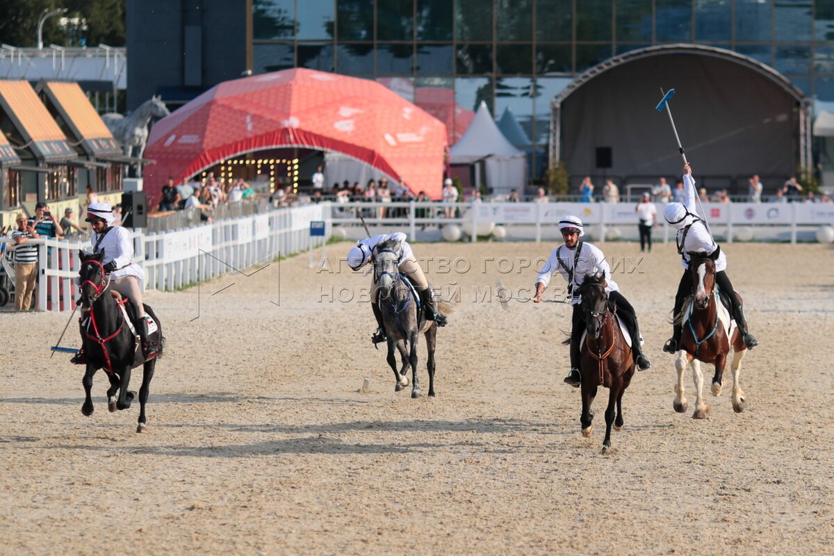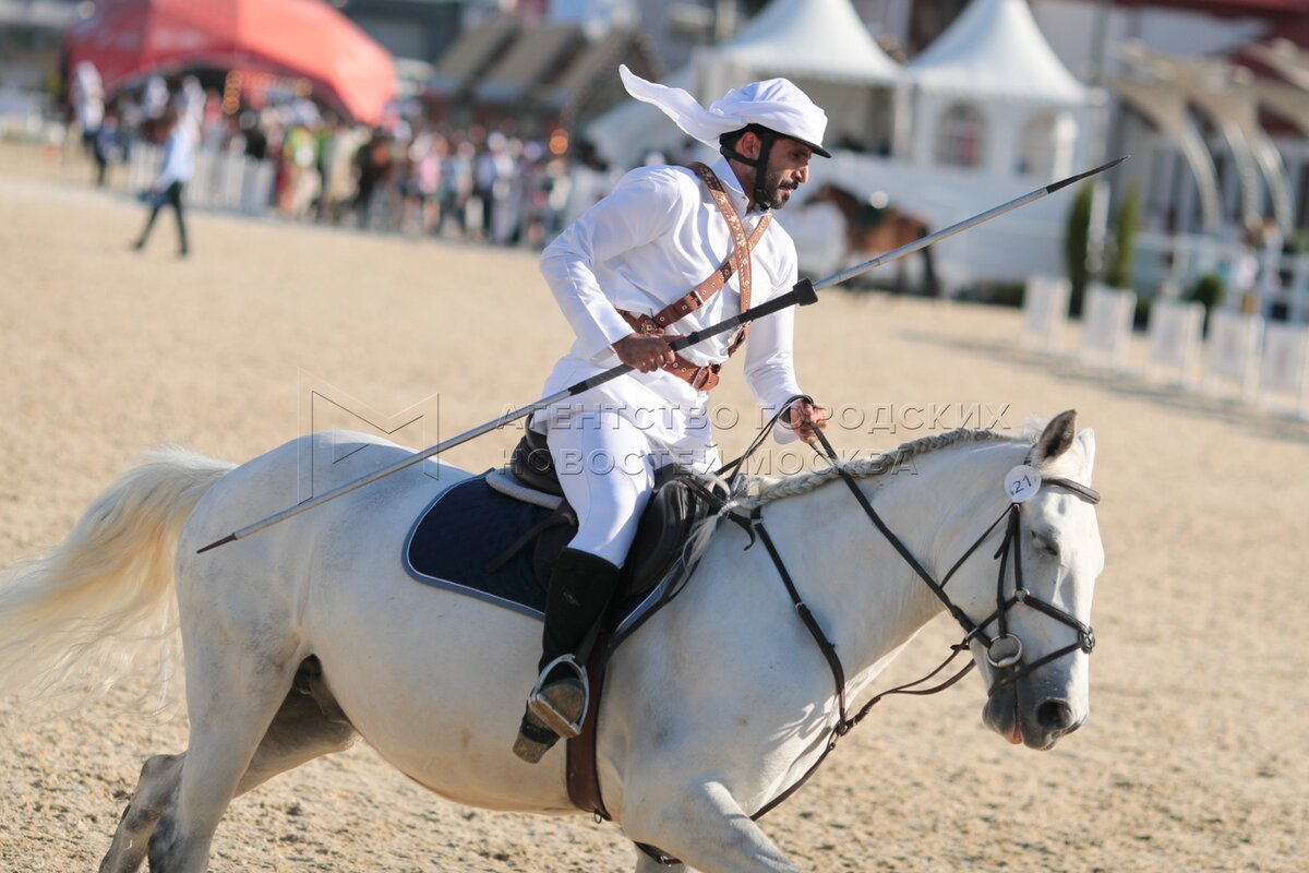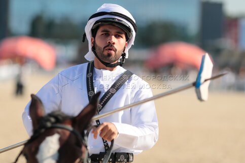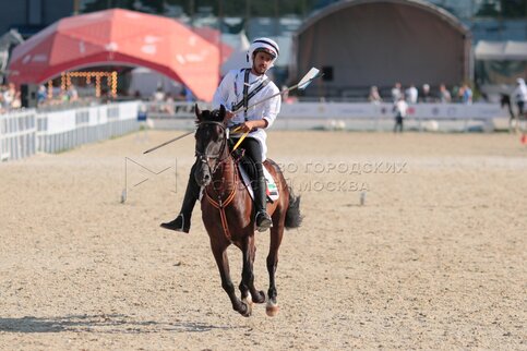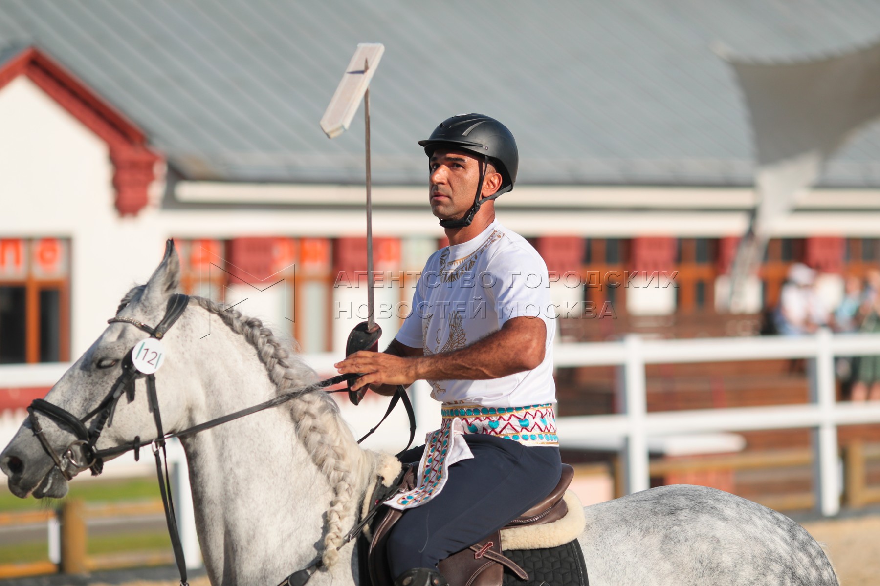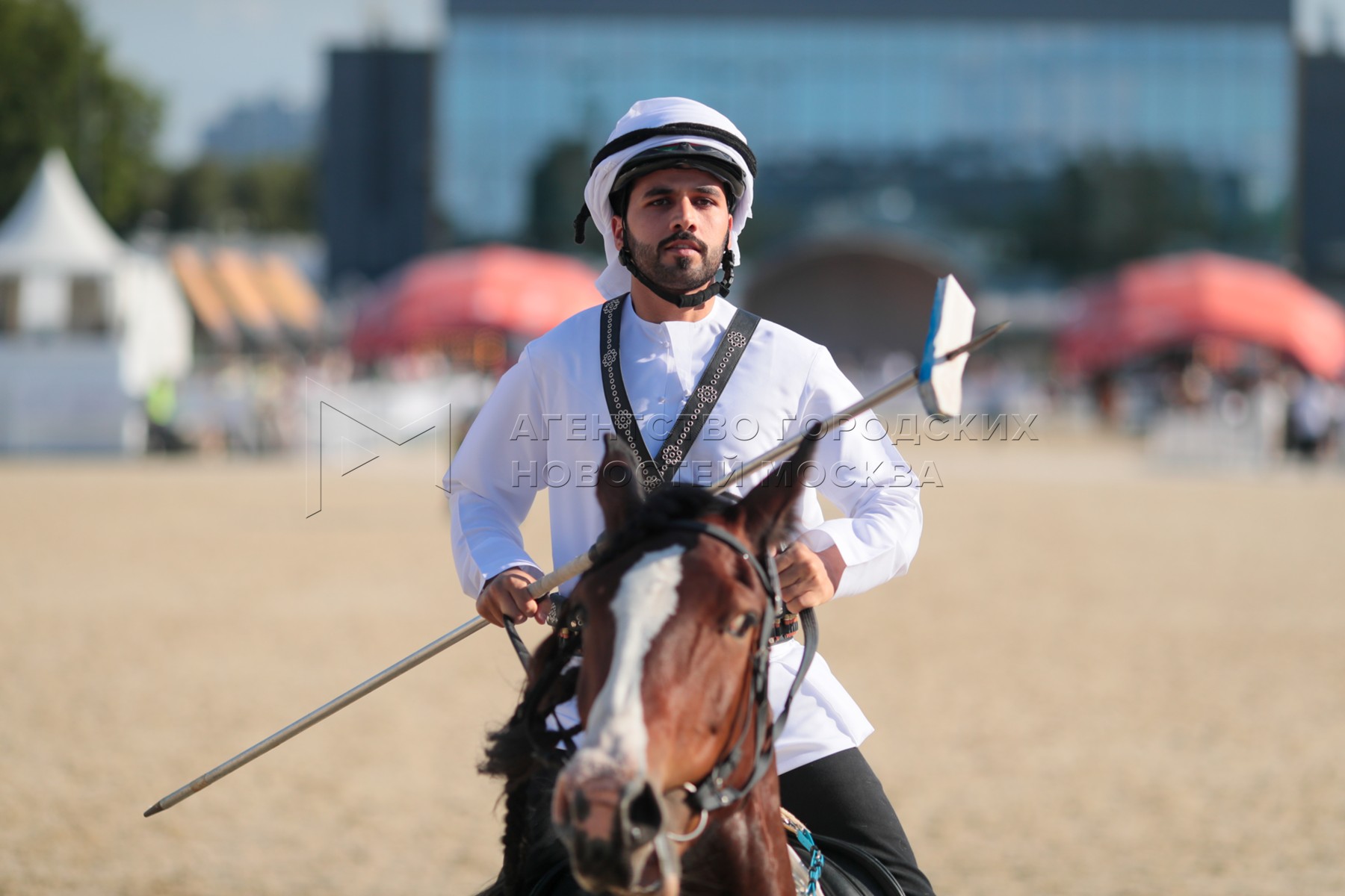 Показательные тренировки команд перед началом международных соревнований по тентпеггингу – вид конного спорта, когда всадники на полном скаку прокалывают маленький предмет на земле – пег (колышек), а затем на острие оружия уносят с собой заканчивая упражнение.