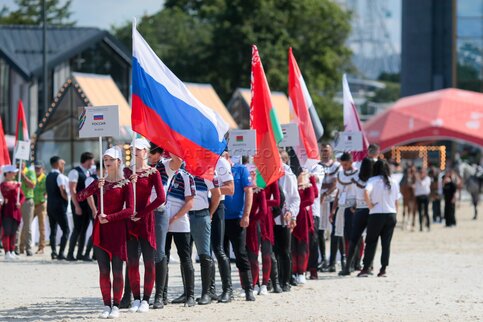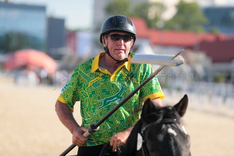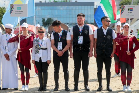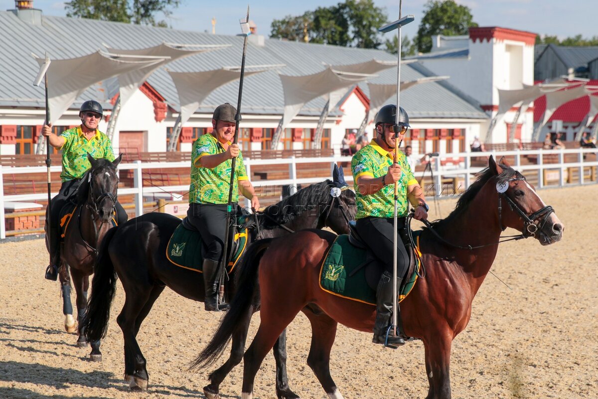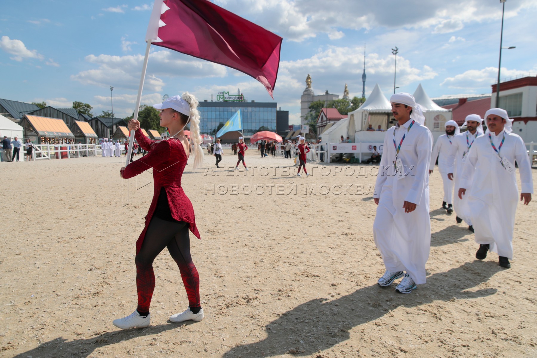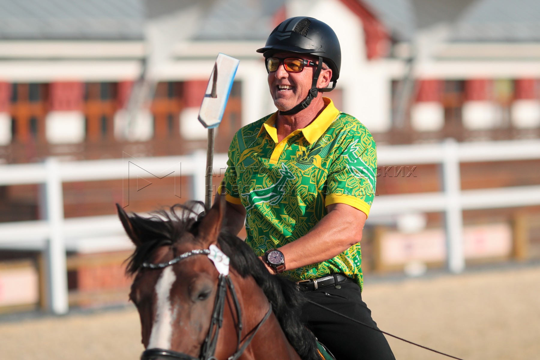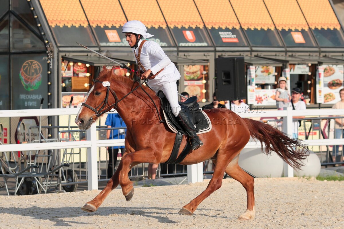 Показательные тренировки команд перед началом международных соревнований по тентпеггингу – вид конного спорта, когда всадники на полном скаку прокалывают маленький предмет на земле – пег (колышек), а затем на острие оружия уносят с собой заканчивая упражнение.