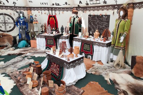 Экспозиция национальных костюмов и товаров народного промысла в старинном летнем ...