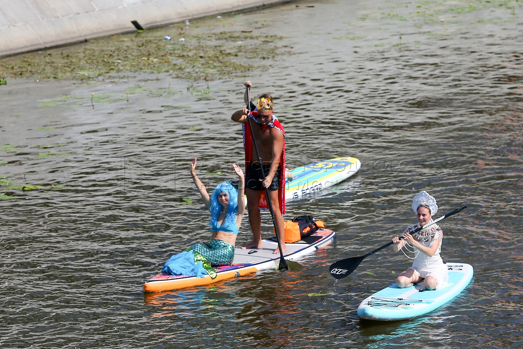 Болотная набережная. Костюмированный сап-заплыв ко Дню московского транспорта на ...