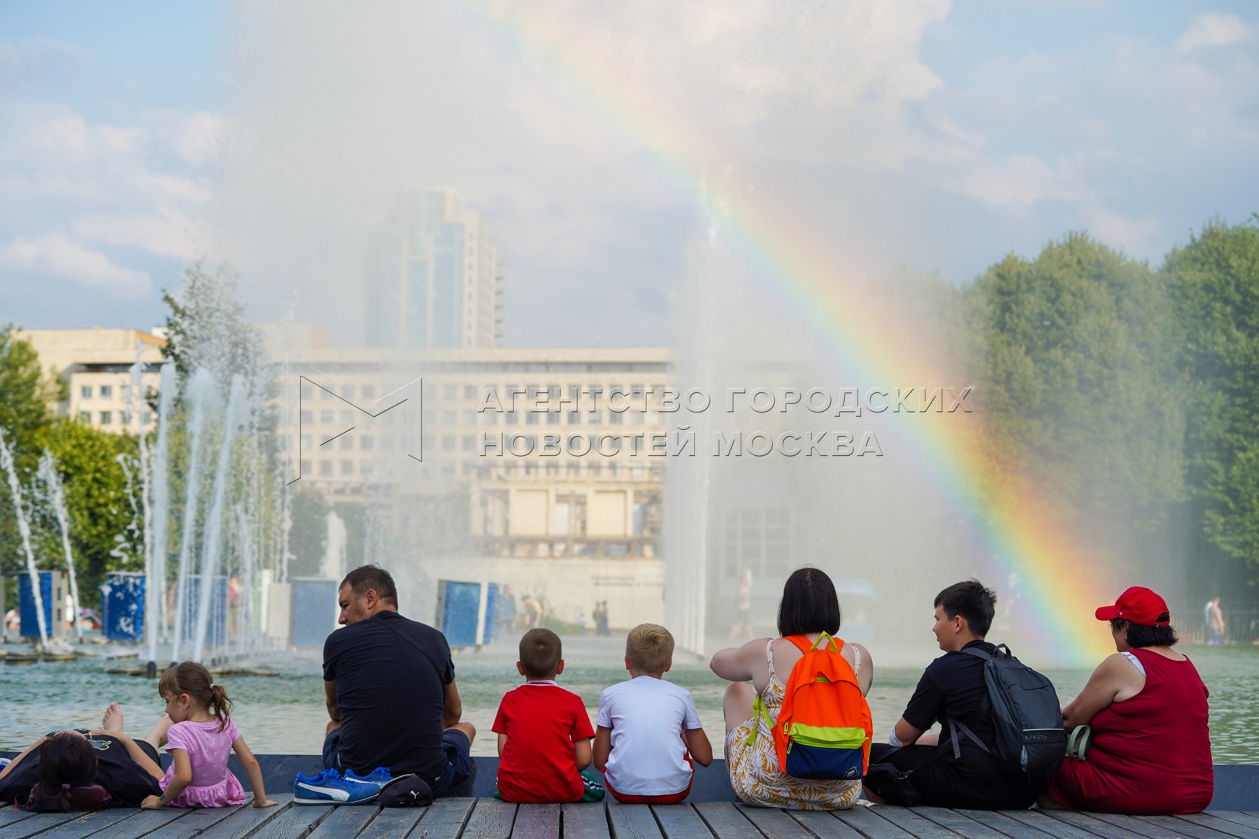 - Описание: Радуга и отдыхающие у фонтана. Городские жанры и виды Москвы 16 июля 2024 года.