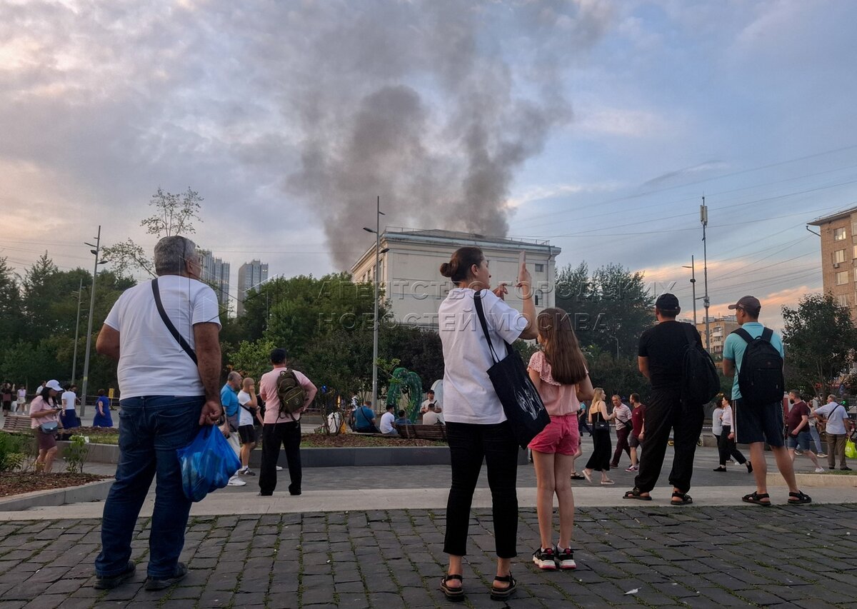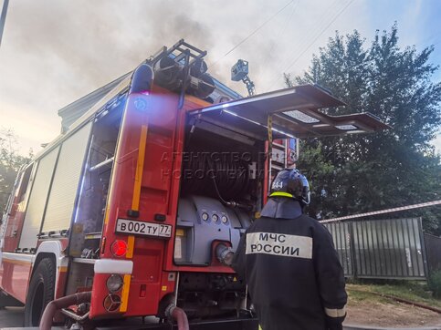 Пожарно-спасательные подразделения на месте возгорания в здании Центра цифровизац...