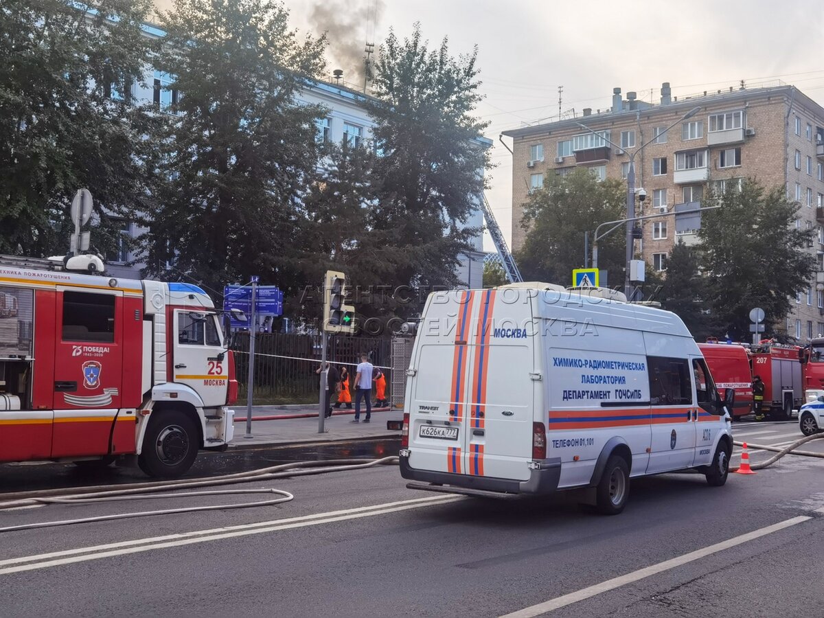 • Описание: Пожарно-спасательные подразделения на месте возгорания в здании Центра цифровизации образования на ул. Пресненский Вал в центре Москвы.