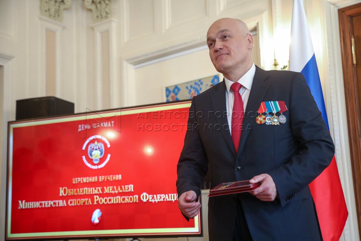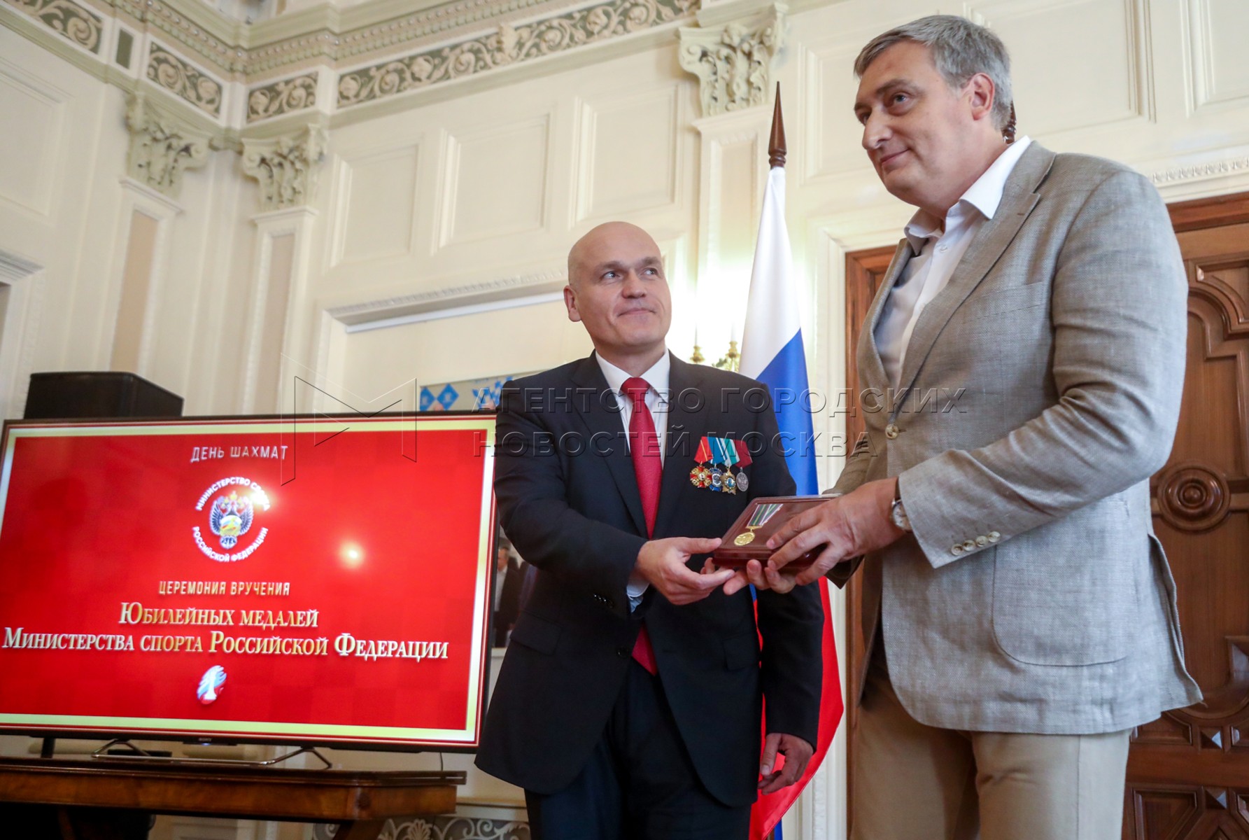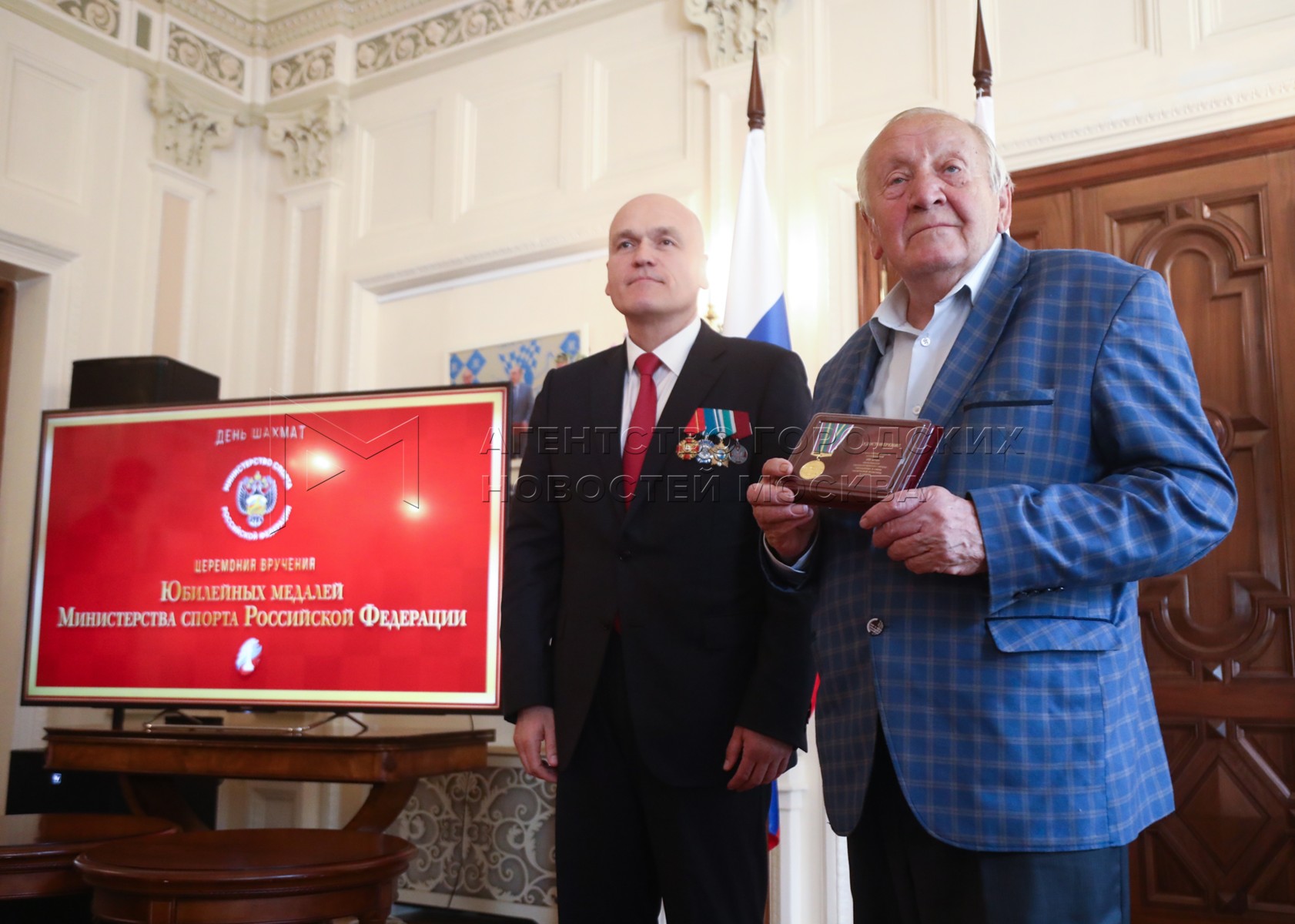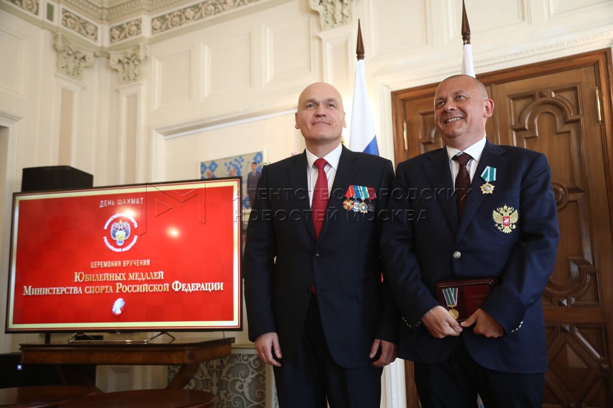 - Описание: Президент Федерации шахмат России Андрей Филатов (слева) и президент Федерации шахмат Московской области, гроссмейстер Сергей Карякин. Торжественное вручение государственных наград шахматистам РФ – медалей в честь 100-летия министерства спорта России и золотых знаков Федерации шахмат России – в Центральном доме шахматиста имени Ботвинника.