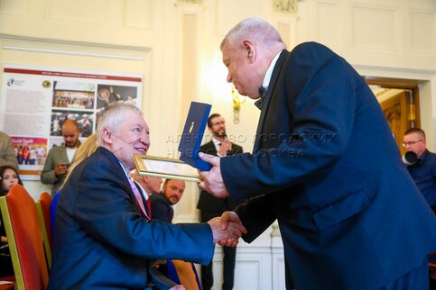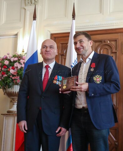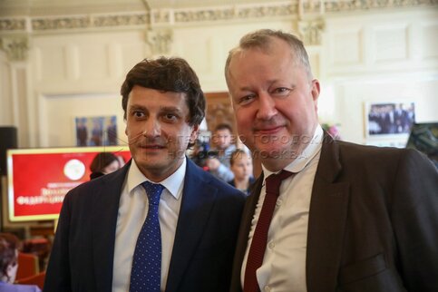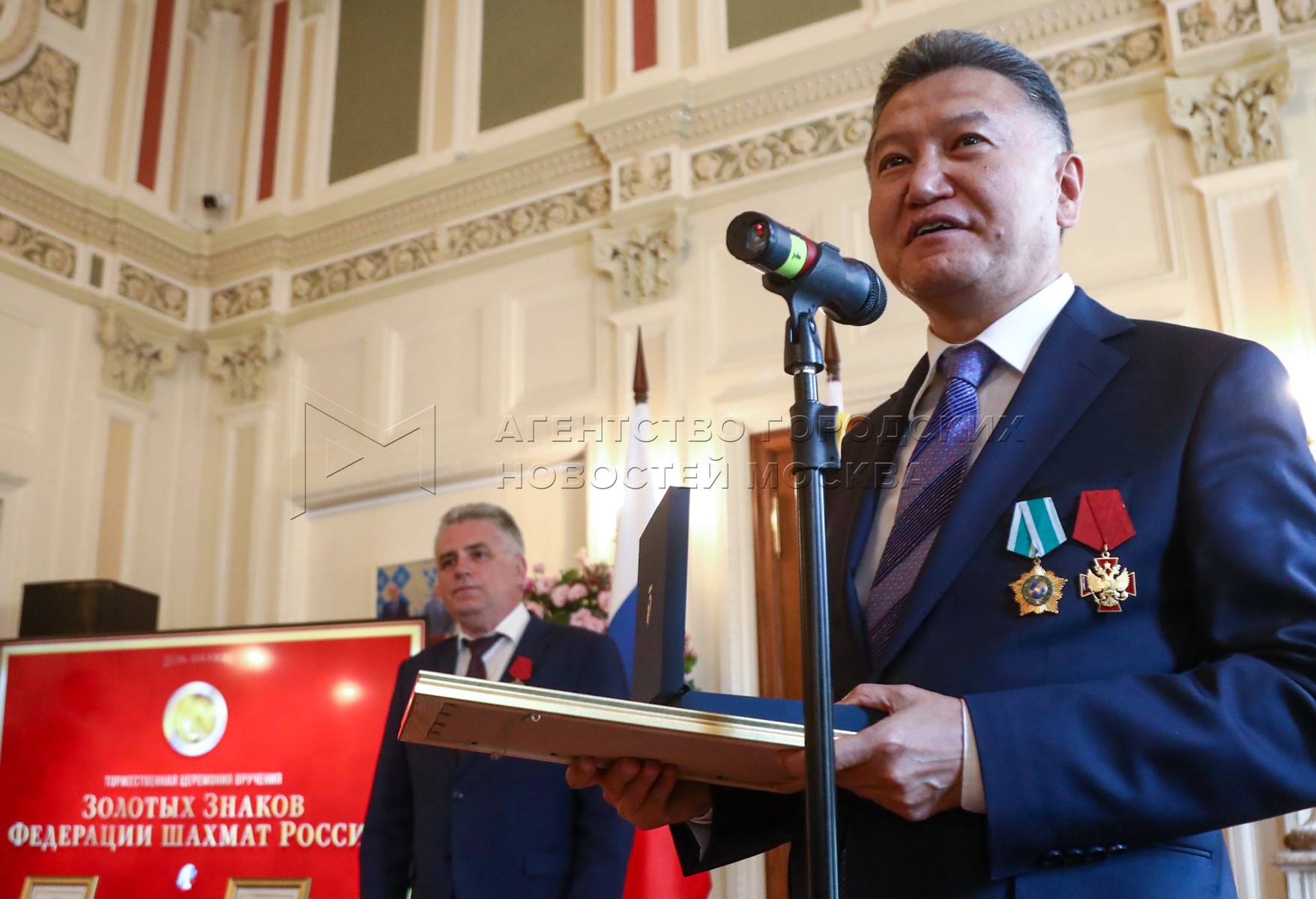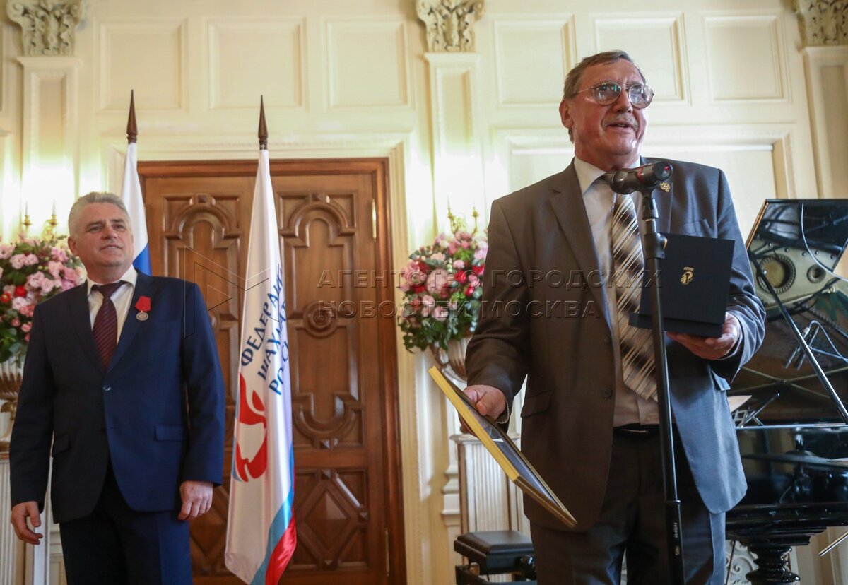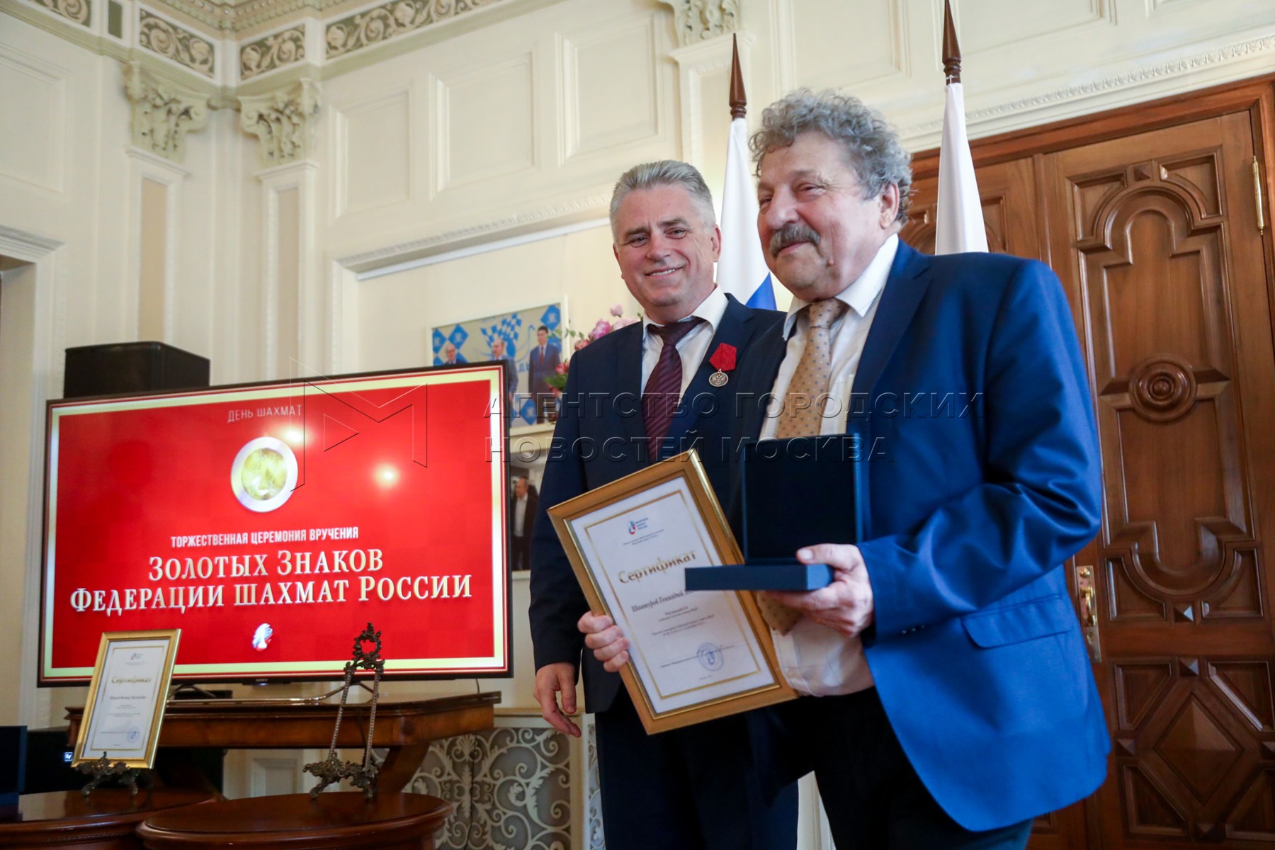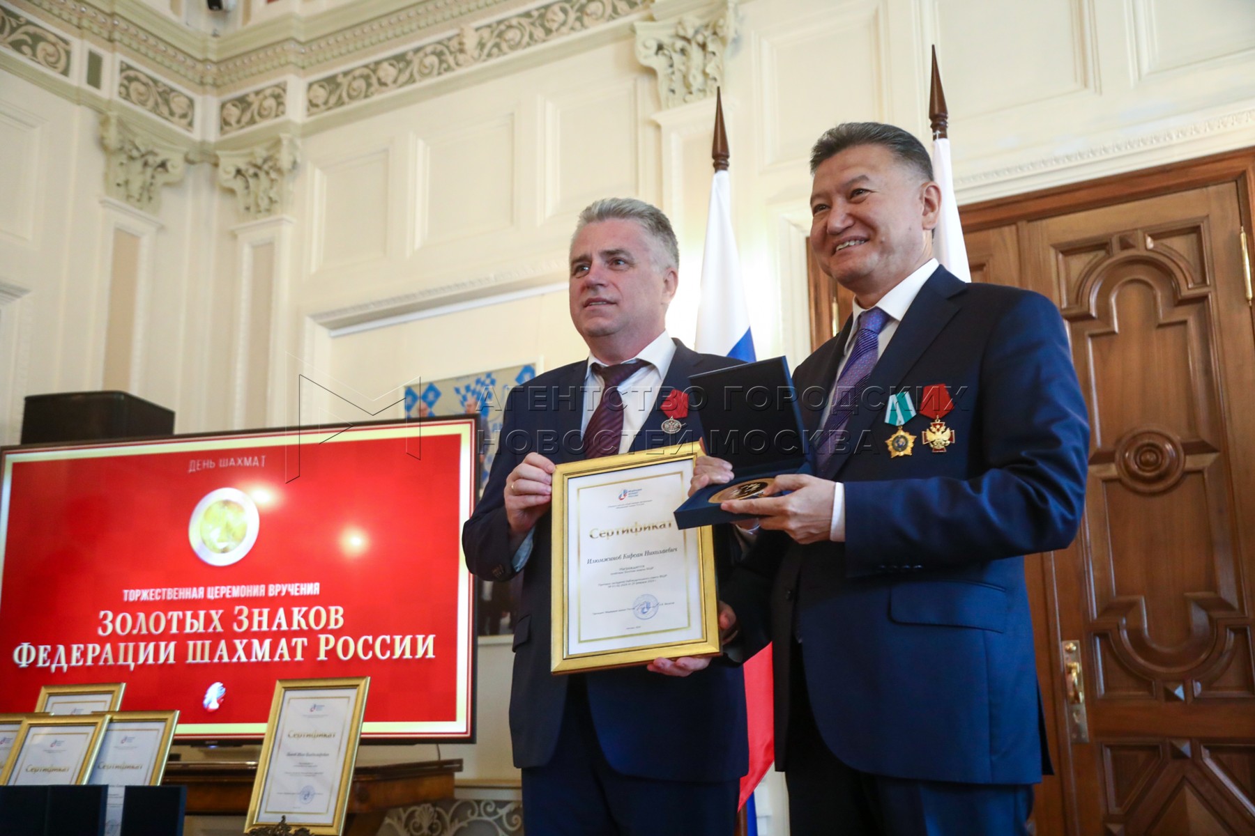 - Описание: Президент Федерации шахмат России Андрей Филатов (слева) и президент Федерации шахмат Московской области, гроссмейстер Сергей Карякин. Торжественное вручение государственных наград шахматистам РФ – медалей в честь 100-летия министерства спорта России и золотых знаков Федерации шахмат России – в Центральном доме шахматиста имени Ботвинника.