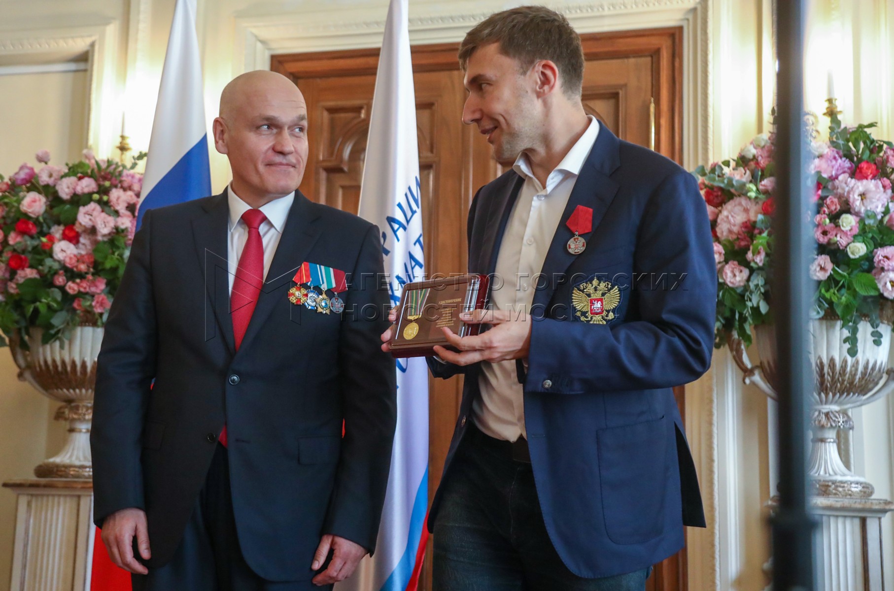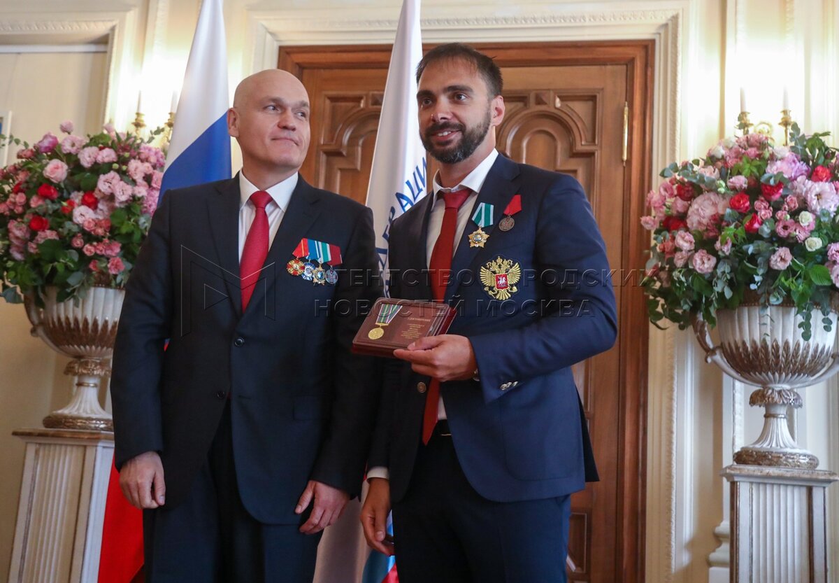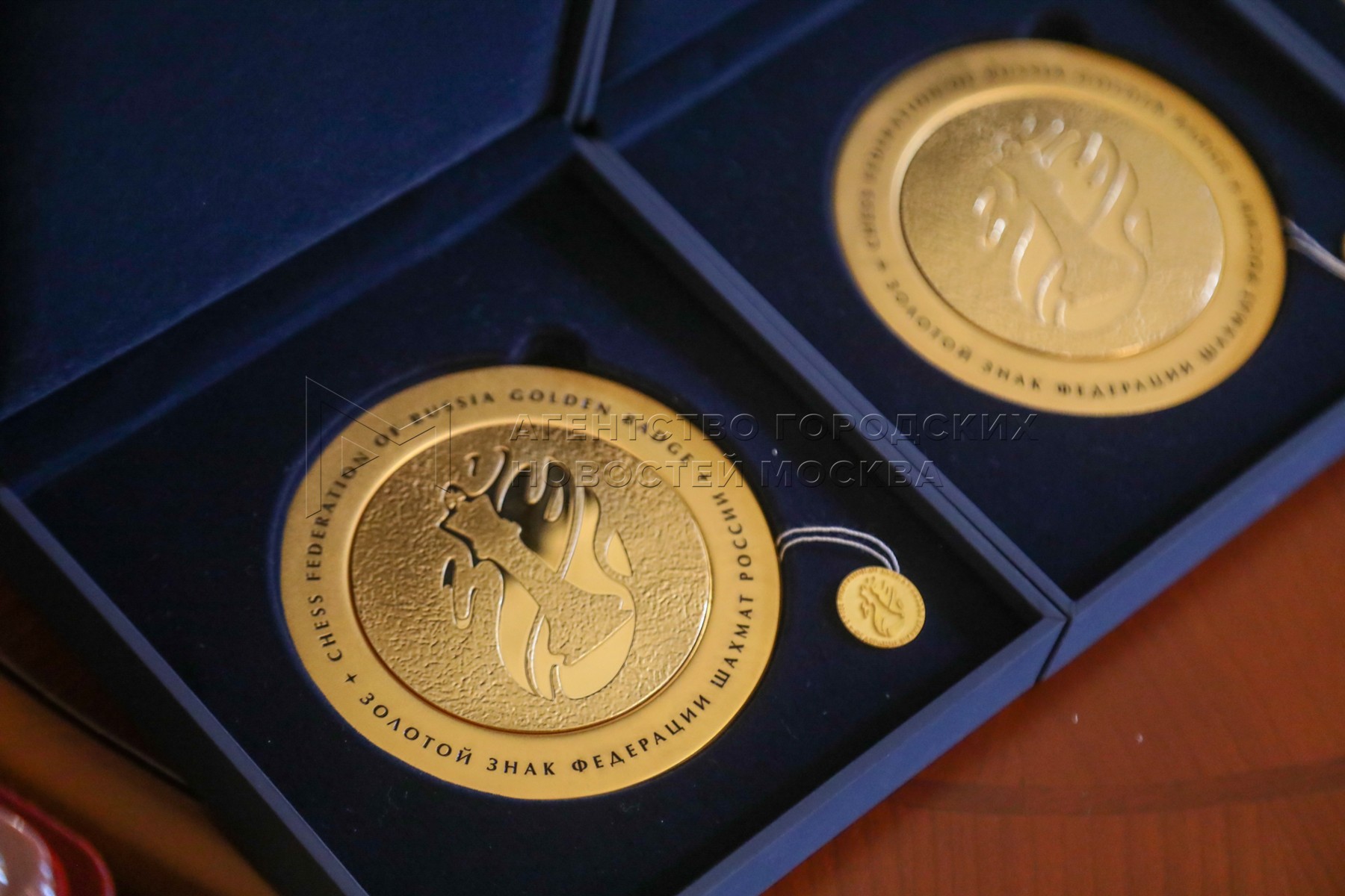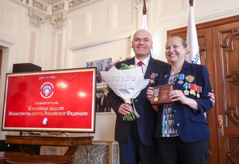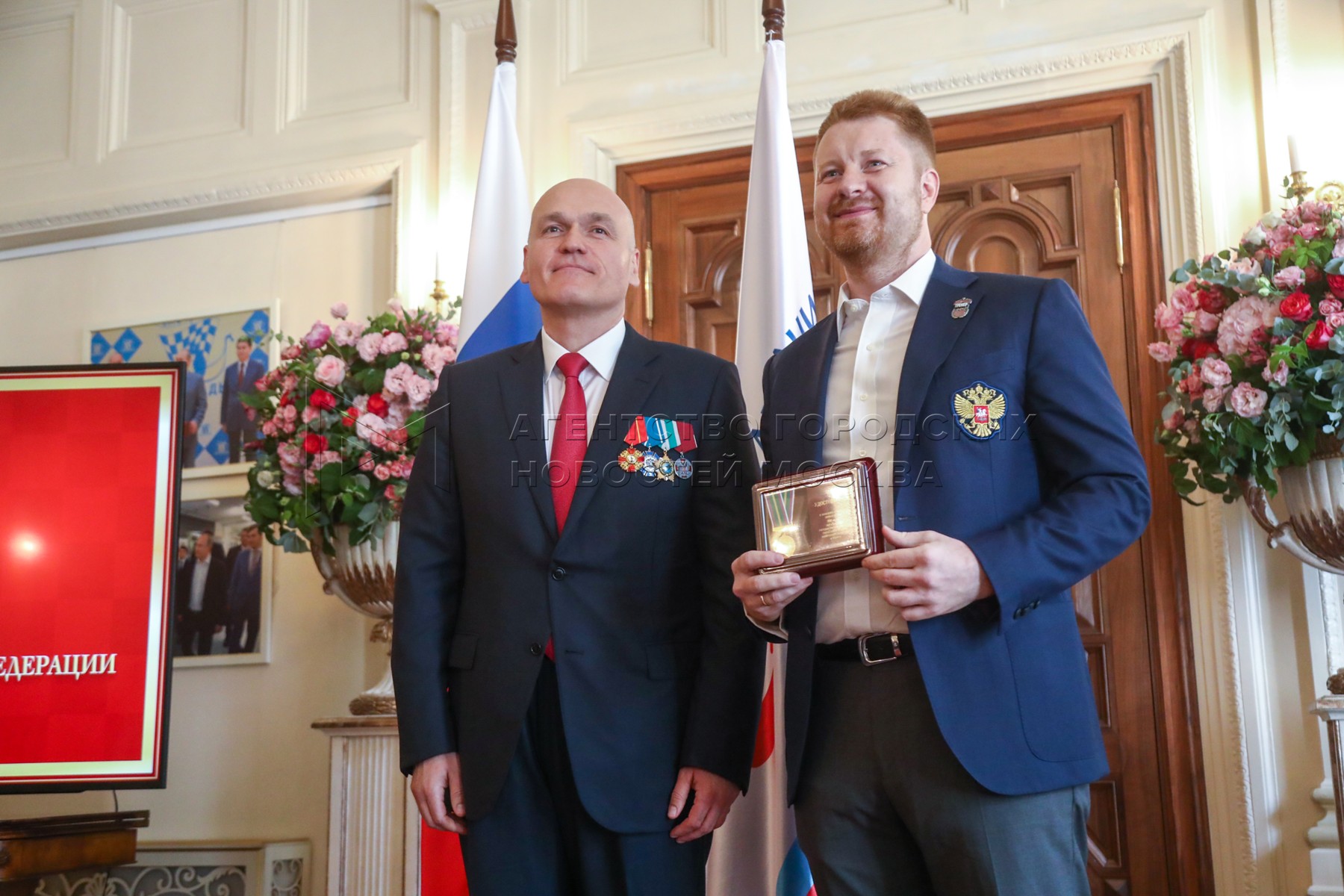 - Описание: Президент Федерации шахмат России Андрей Филатов (слева) и президент Федерации шахмат Московской области, гроссмейстер Сергей Карякин. Торжественное вручение государственных наград шахматистам РФ – медалей в честь 100-летия министерства спорта России и золотых знаков Федерации шахмат России – в Центральном доме шахматиста имени Ботвинника.