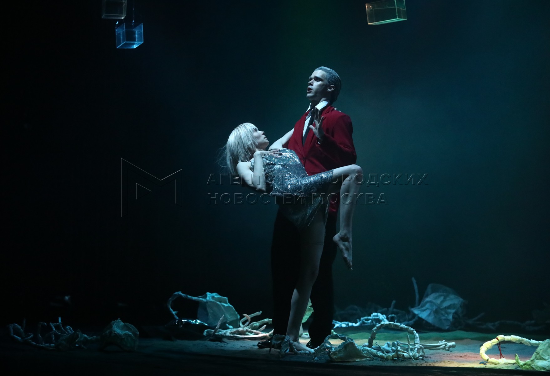 Актеры Николай Рысев в роли Алонзо, короля Неополитанского и Евгения Леонова в роли Ариэль, духа, покорного Просперо. Показ премьерного спектакля Театра Москвы «Буря» в постановке Ивана Шалаева на сцене Московского драматического театра имени Ермоловой.