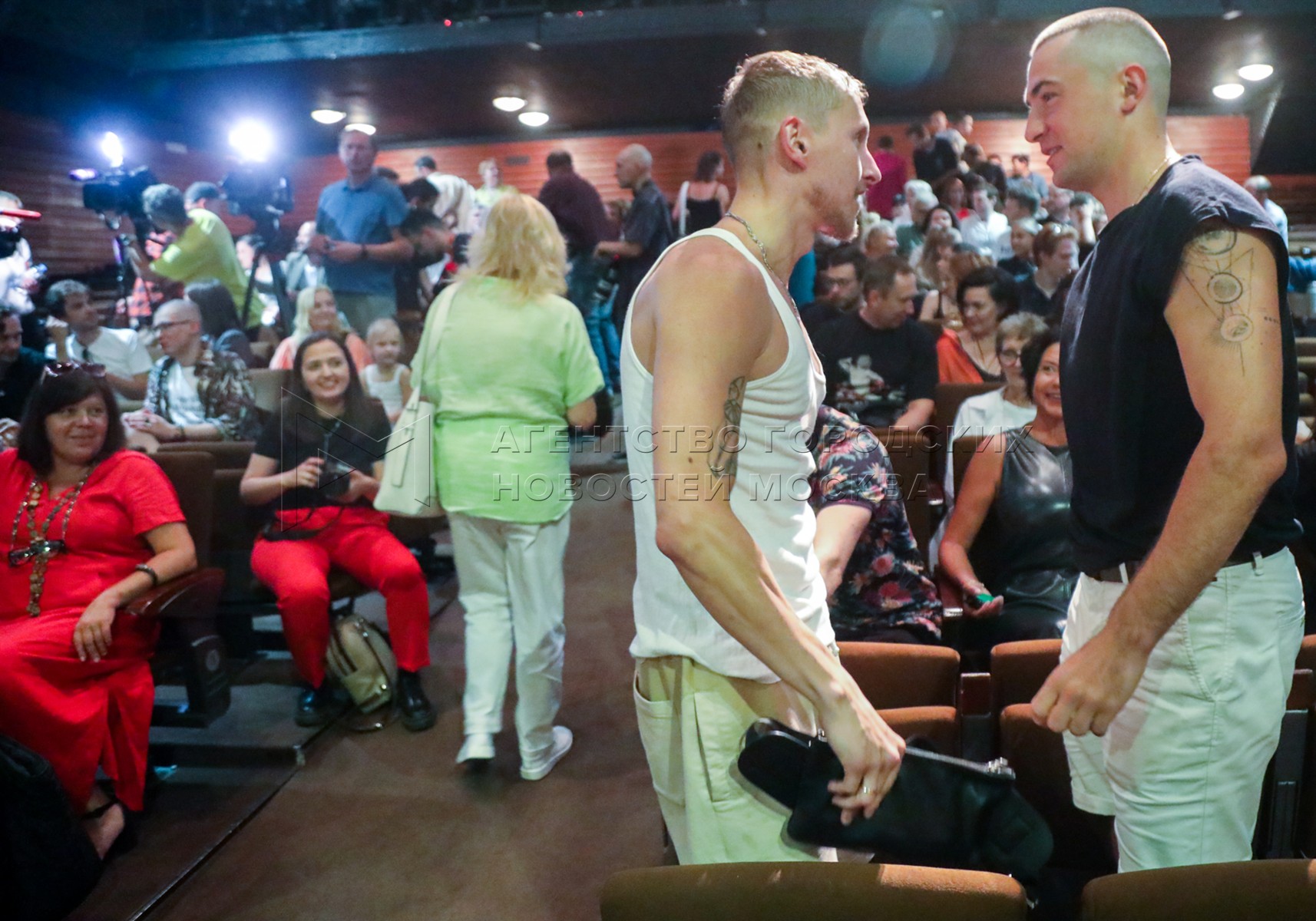 Актеры Ксения Мон Сор и Сергей Трифонов во время сбора труппы Московского театра ...