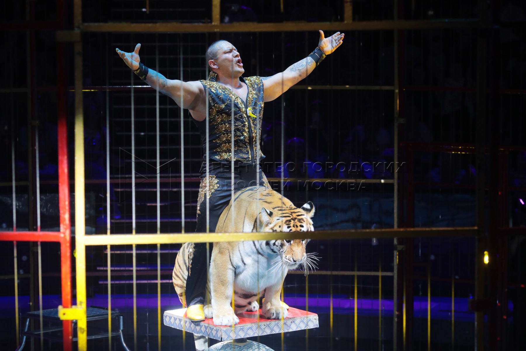 • Описание: Дрессированные тигры и львы под руководством Карлоса Брешиани, продюсерский центр Влада Гончарова (Гватемала). Третий день всемирного фестиваля циркового искусства «Идол-2024» на манеже Большого Московского государственного цирка на проспекте Вернадского.