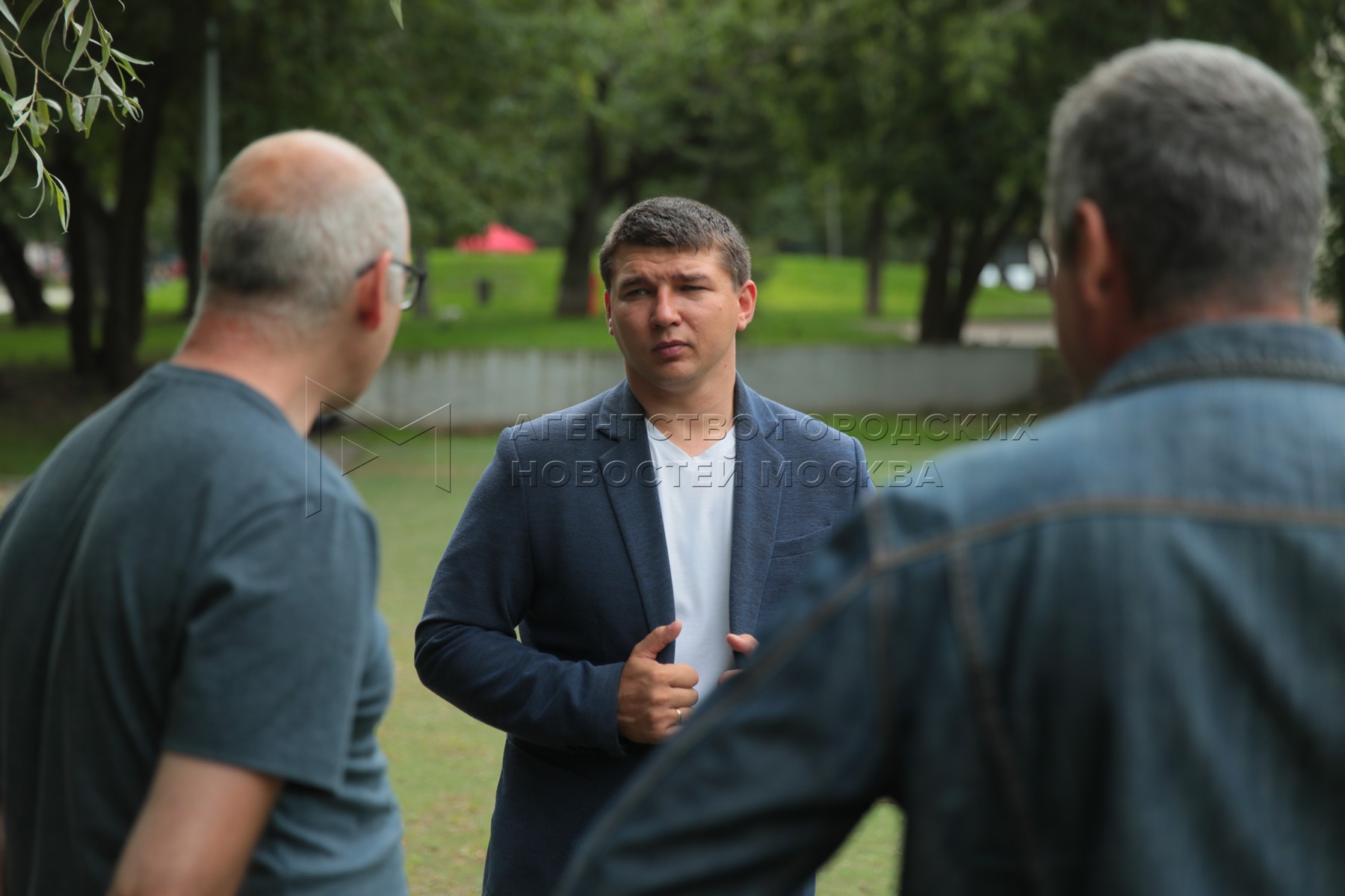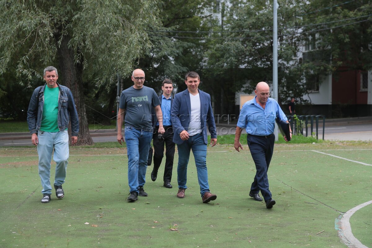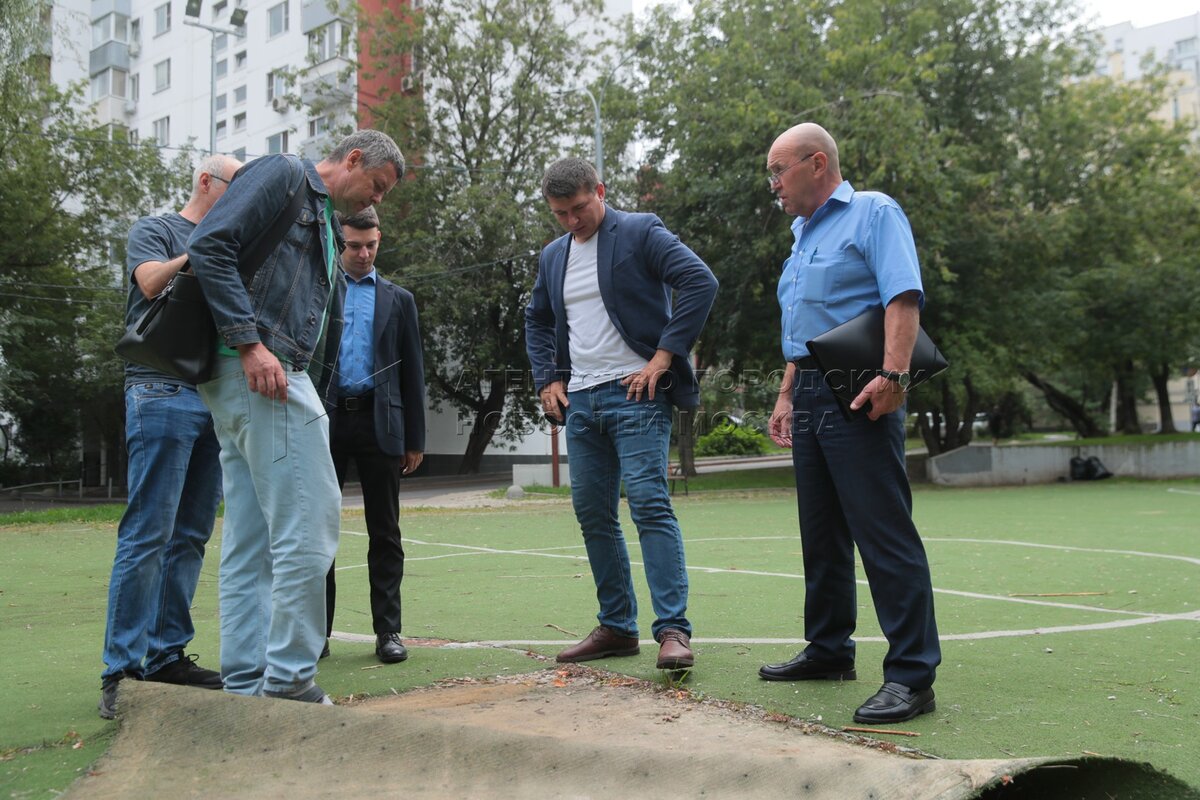 Общественный активист, руководитель Московского городского отделения Всероссийского студенческого корпуса спасателей Максим Джетыгенов (второй справа) провел общественную инспекцию начала работ по реконструкции спортивной площадки в Живаревом сквере в Красносельском районе.