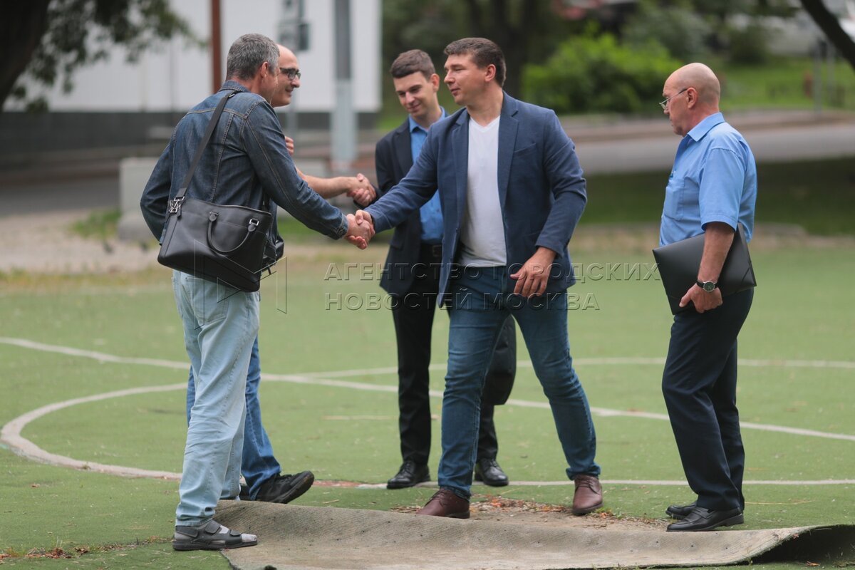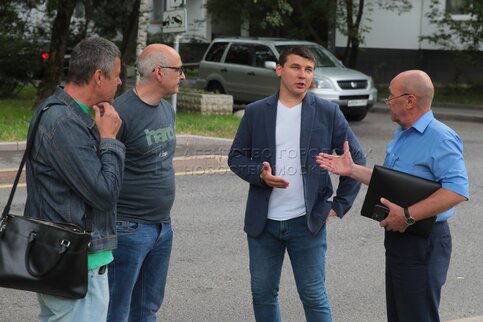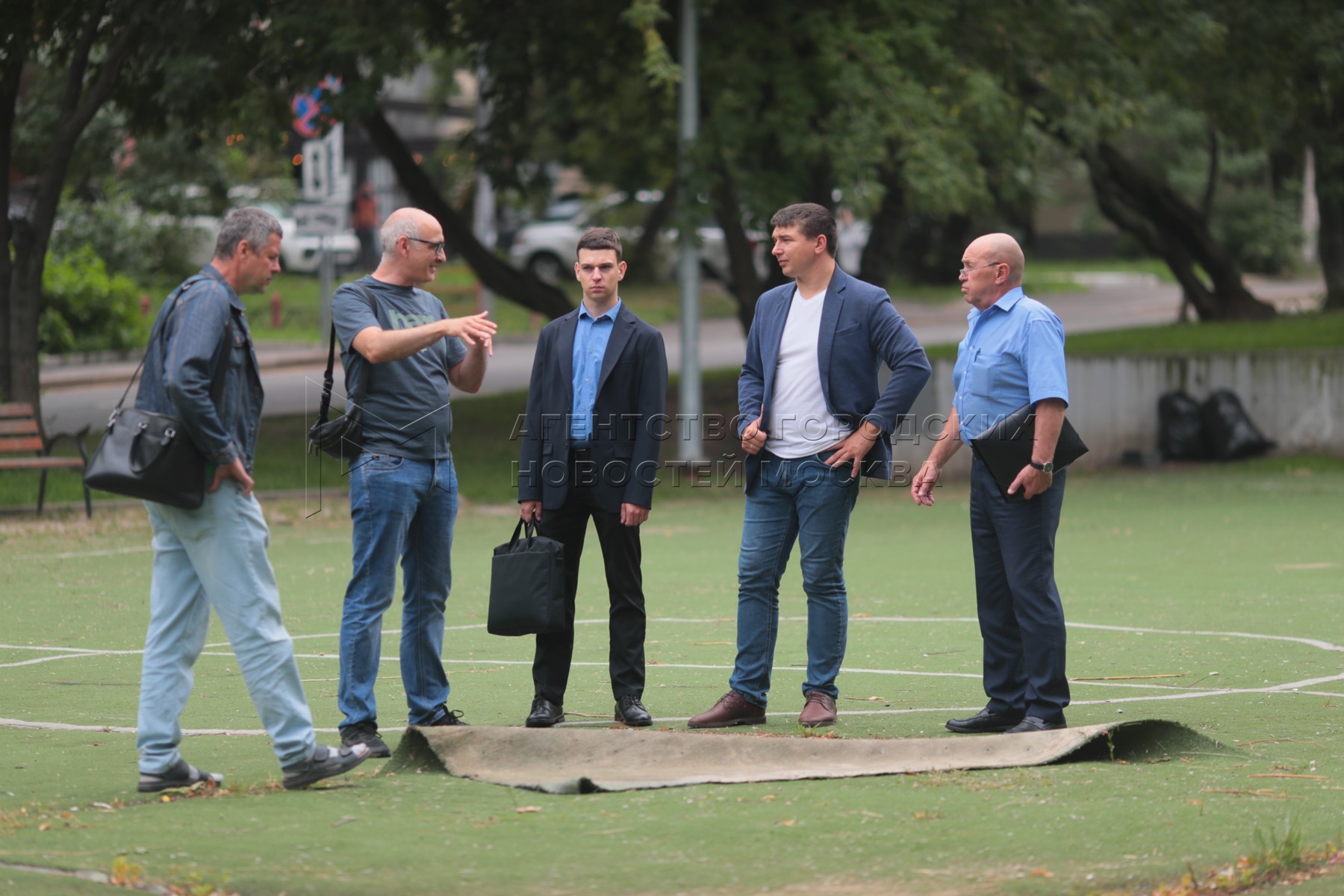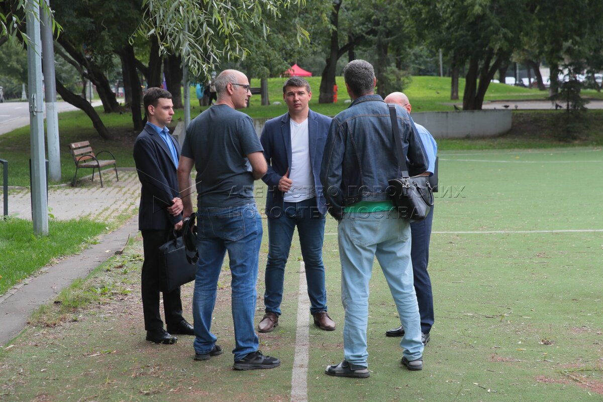 Общественный активист, руководитель Московского городского отделения Всероссийского студенческого корпуса спасателей Максим Джетыгенов (второй справа) провел общественную инспекцию начала работ по реконструкции спортивной площадки в Живаревом сквере в Красносельском районе.