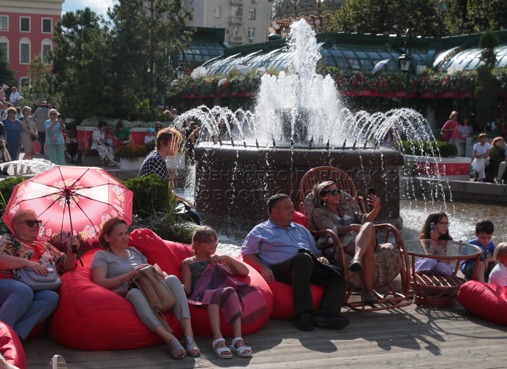 Лаунж-зона у фонтана. Фестиваль впечатлений «Московское чаепитие» на Тверской пло...