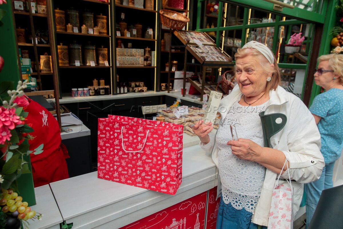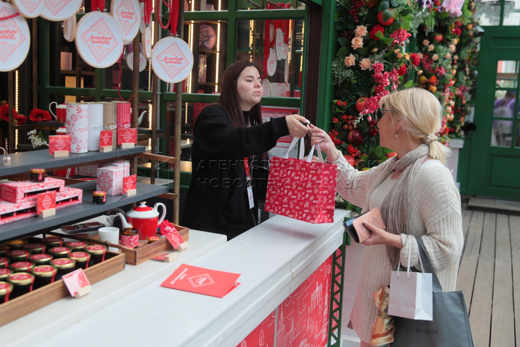 Покупательница возле чайной станции. Фестиваль впечатлений «Московское чаепитие» ...