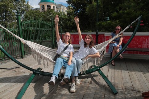 Отдыхающие в гамаке. Фестиваль впечатлений «Московское чаепитие» на Тверской площ...
