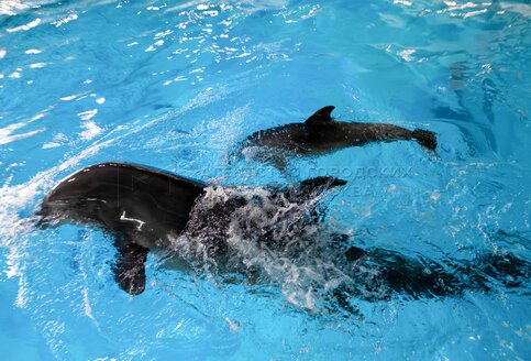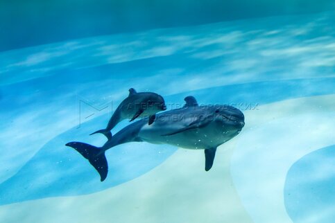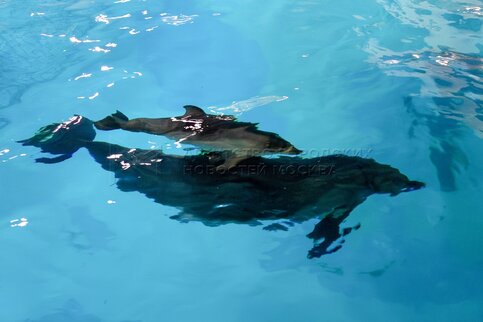 • Описание: Новорожденный детеныш черноморской афалины, занесенной в Красную книгу России, со своей матерью Пулей в центре океанографии и морской биологии «Москвариум» на ВДНХ. Фото: пресс-служба Центра океанографии и морской биологии «Москвариум».