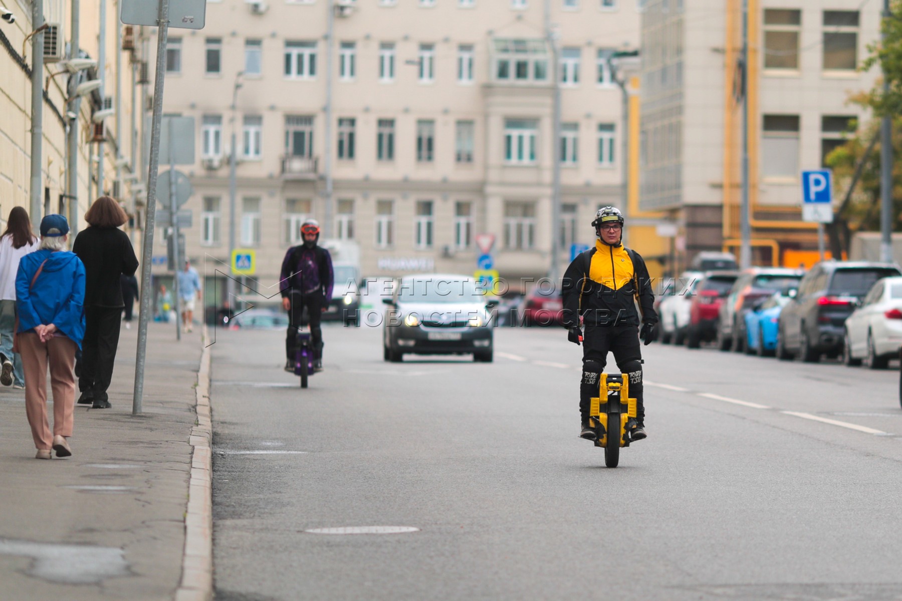 - Описание: Мужчины передвигаются по столице на моноколесе. На водителях индивидуального транспортного средства надет шлем.