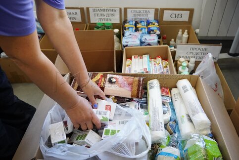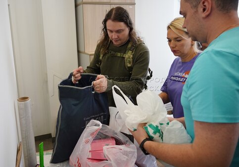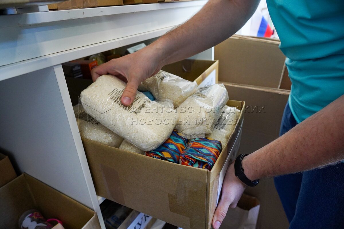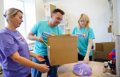 - Описание: Штаб крупнейшего Ресурсного центра добровольчества столицы «Мосволонтёр» «Москва помогает» по адресу: Ленинградский проспект, д. 5, стр. 1, во время сбора необходимых вещей для пострадавших в Курской области.