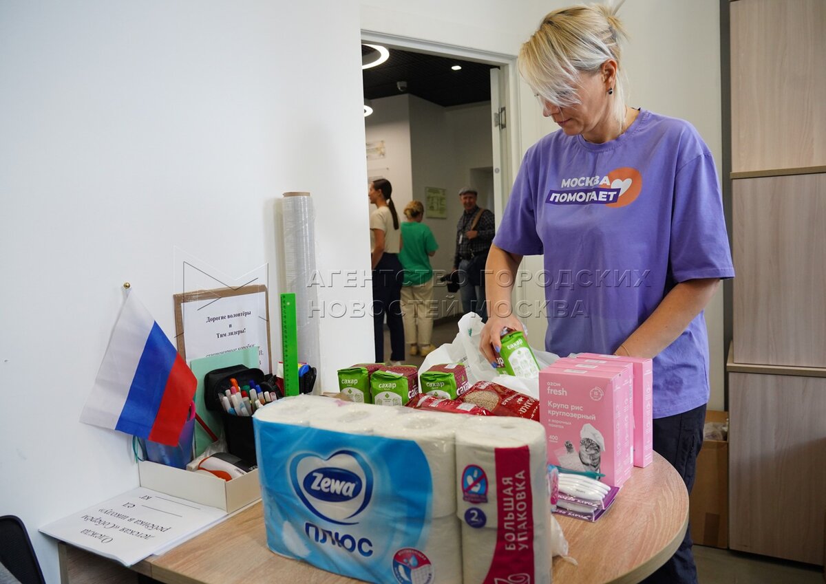 Штаб крупнейшего Ресурсного центра добровольчества столицы «Мосволонтёр» «Москва помогает» по адресу: Ленинградский проспект, д. 5, стр. 1, во время сбора необходимых вещей для пострадавших в Курской области.