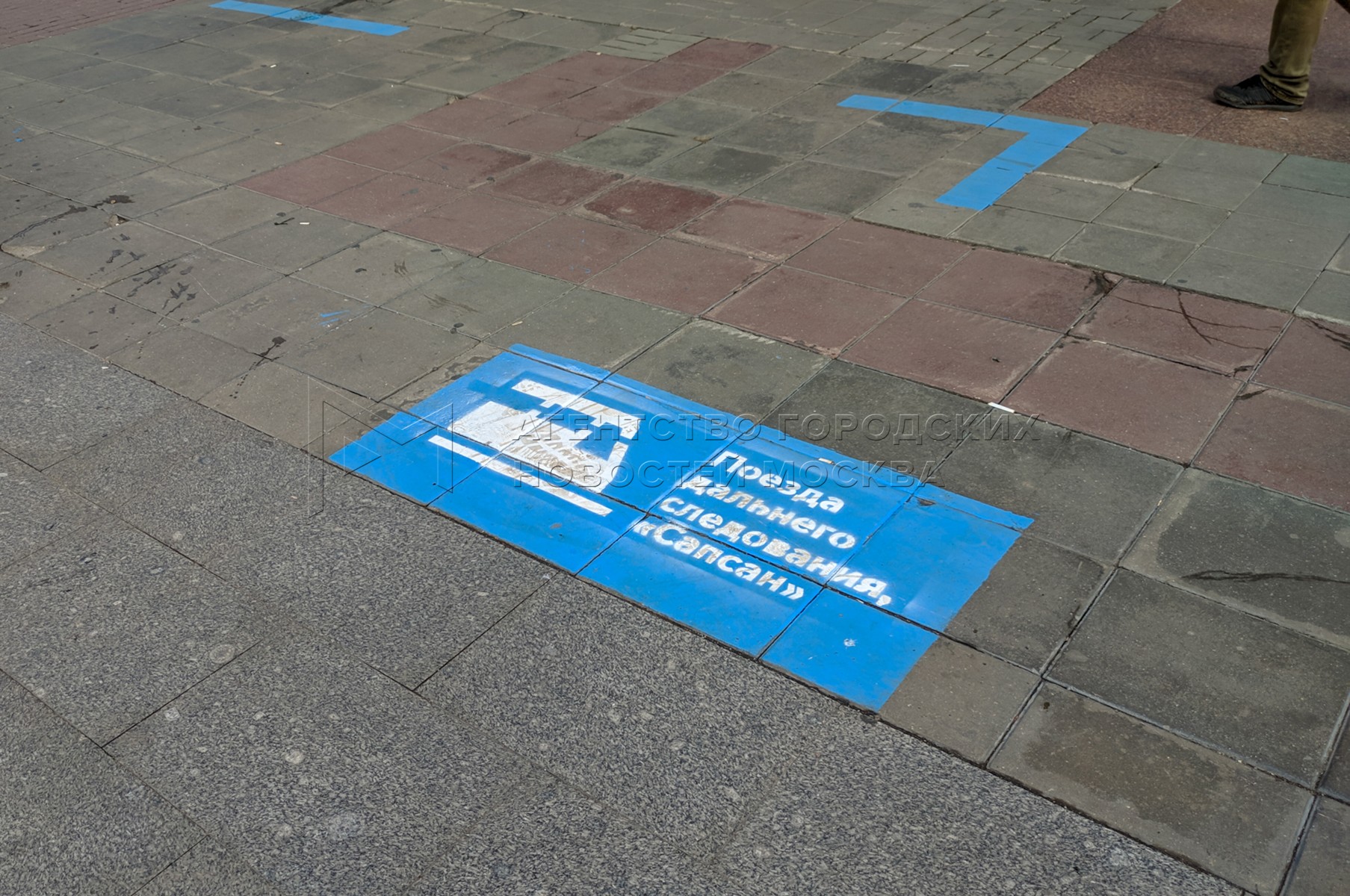 • Описание: Напольная навигация для прохода пассажиров к платформам появилась у Ленинградского вокзала в связи с закрытием его здания на ремонт.