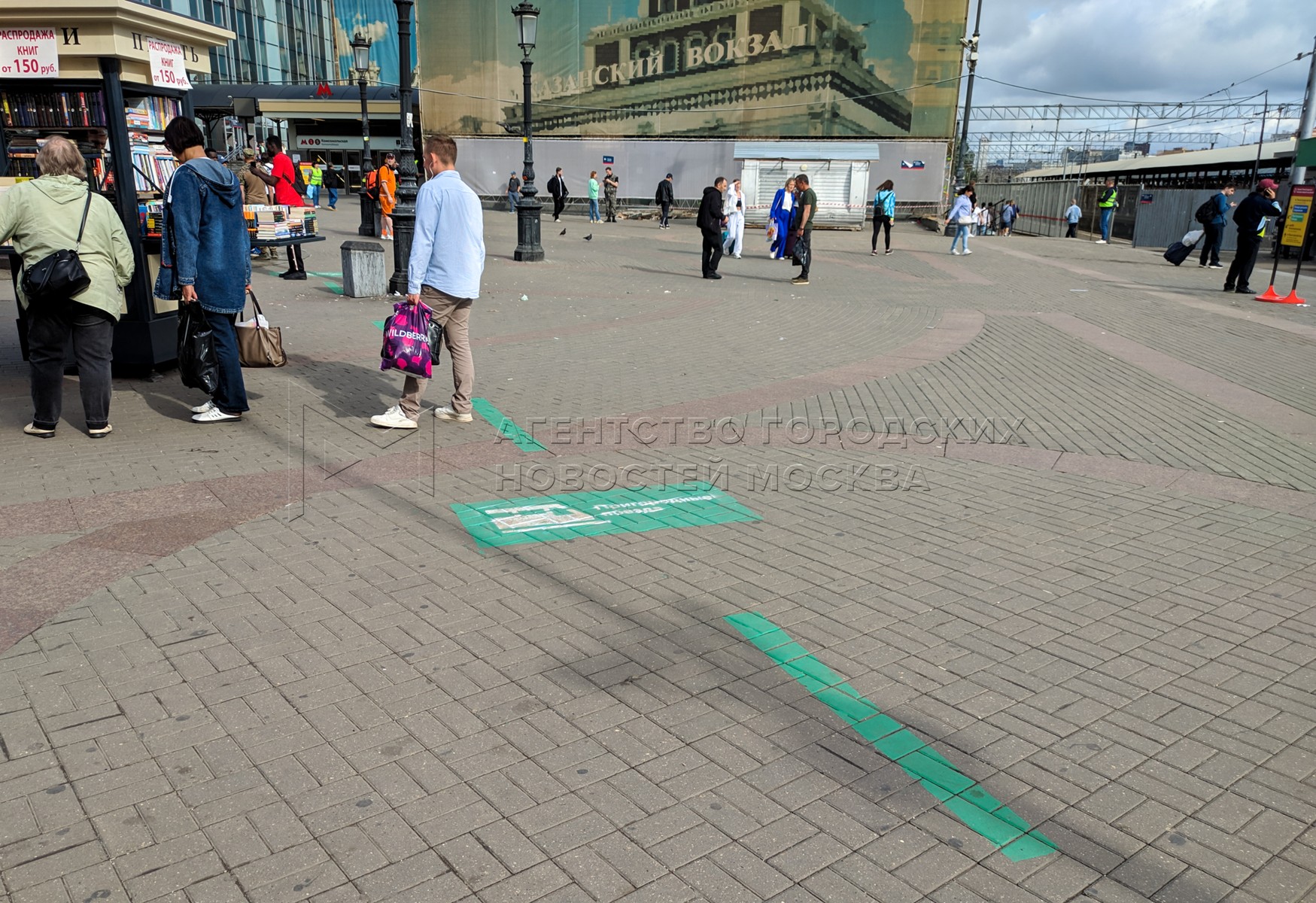 Напольная навигация для прохода пассажиров к платформам появилась у Ленинградского вокзала в связи с закрытием его здания на ремонт.