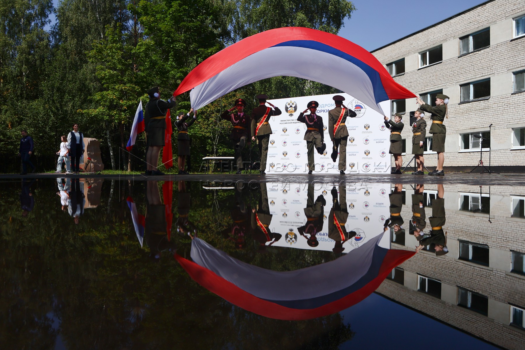 Юнармейский отряд патриотического клуба «Наследники Победы» средней школы N 1 имени профессора В.А. Федорова» и российский триколор. Открытие ко Дню авиации аэродрома «Борки», построенного в 1941 году.