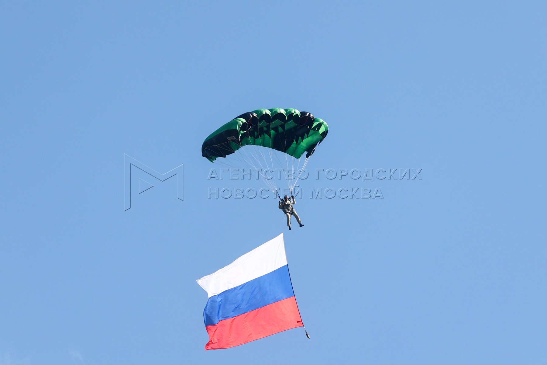 - Описание: Парашютист в небе с российским триколором. Открытие ко Дню авиации аэродрома «Борки», построенного в 1941 году.