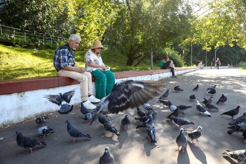 Кормление голубей. Благоустроенная территория около Кировоградских прудов в столи...