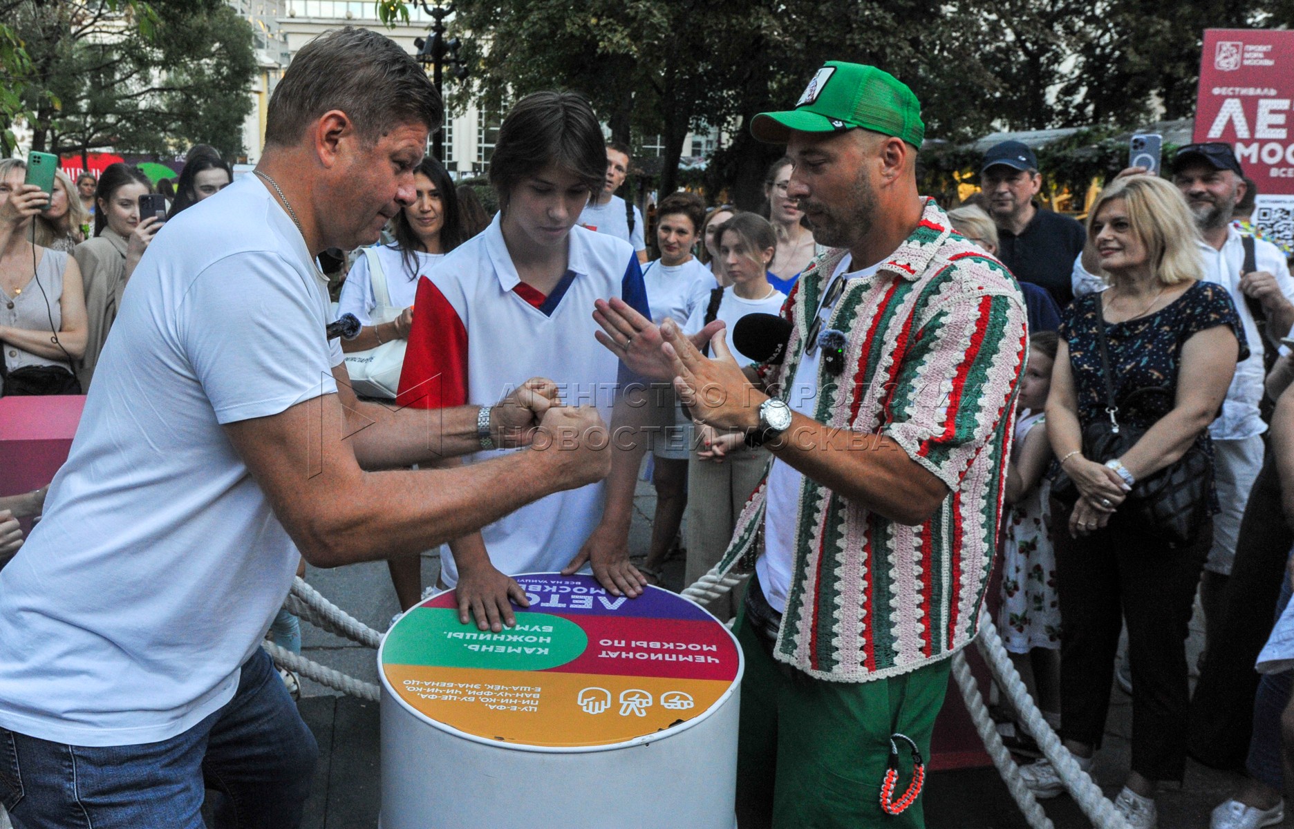 - Описание: Спортивный комментатор Дмитрий Губерниев (слева) и телеведущий Владимир Маркони на чемпионате по игре «Камень, ножницы, бумага» в рамках фестиваля «Лето в Москве. Все на улицу!» на Чистопрудном бульваре.