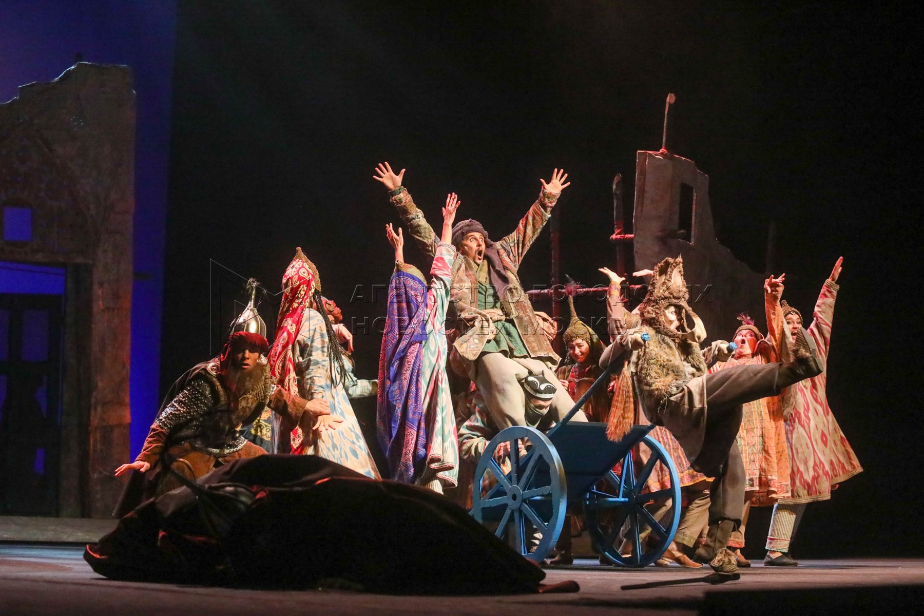 Актеры Руфат Акчурин в роли Ходжи Насреддина (в центре) во время показа музыкальн...