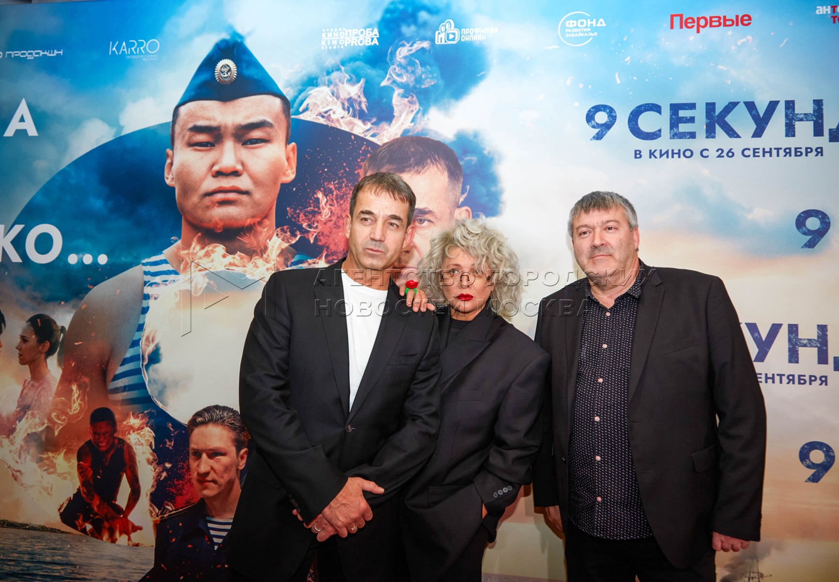 - Описание: Актер Дмитрий Певцов, его супруга актриса Ольга Дроздова и режиссер фильма Олег Штром (слева направо). Премьера в кинотеатре «Октябрь» драмы режиссера Олега Штрома «9 секунд» о героическом подвиге 19-летнего матроса Тихоокеанского флота Алдара Цыденжапова.