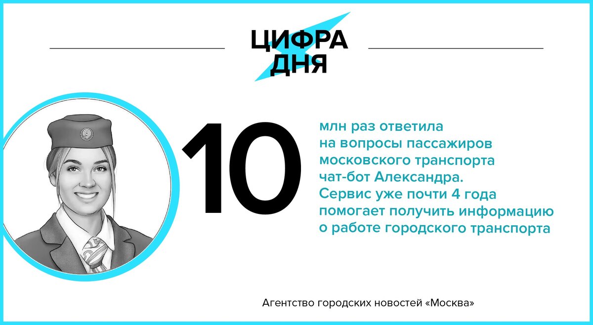 • Заголовок: Цифра дня 30 сентября: 10 млн раз ответила на вопросы пассажиров транспорта Москвы чат-бот Александра