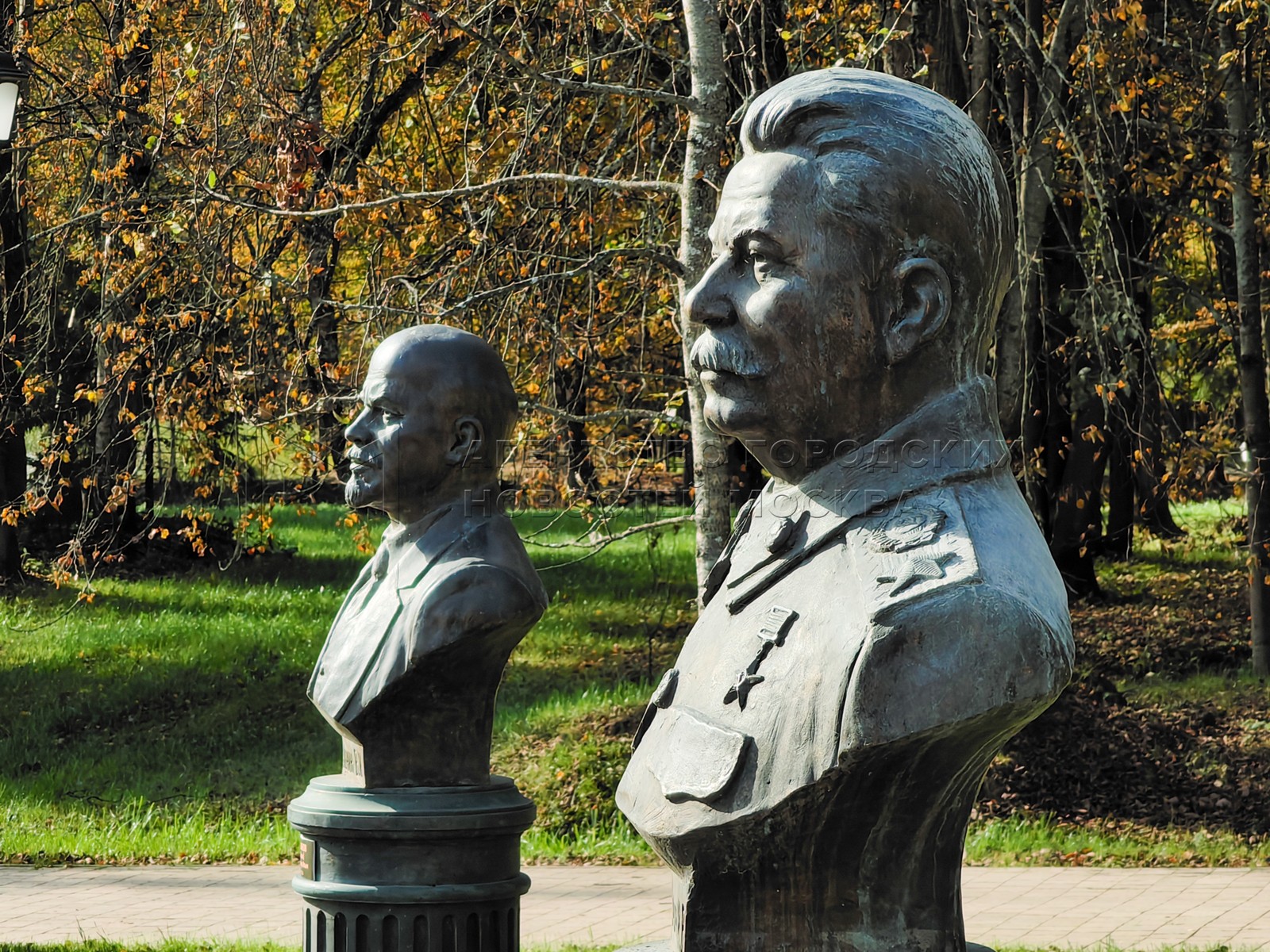 Памятники В.И. Ленину (слева) и И.В. Сталину (автор – Зураб Церетели). Открытие «Аллеи правителей России» в усадьбе Василия Татищева в селе Болдино (городской округ Солнечногорск).