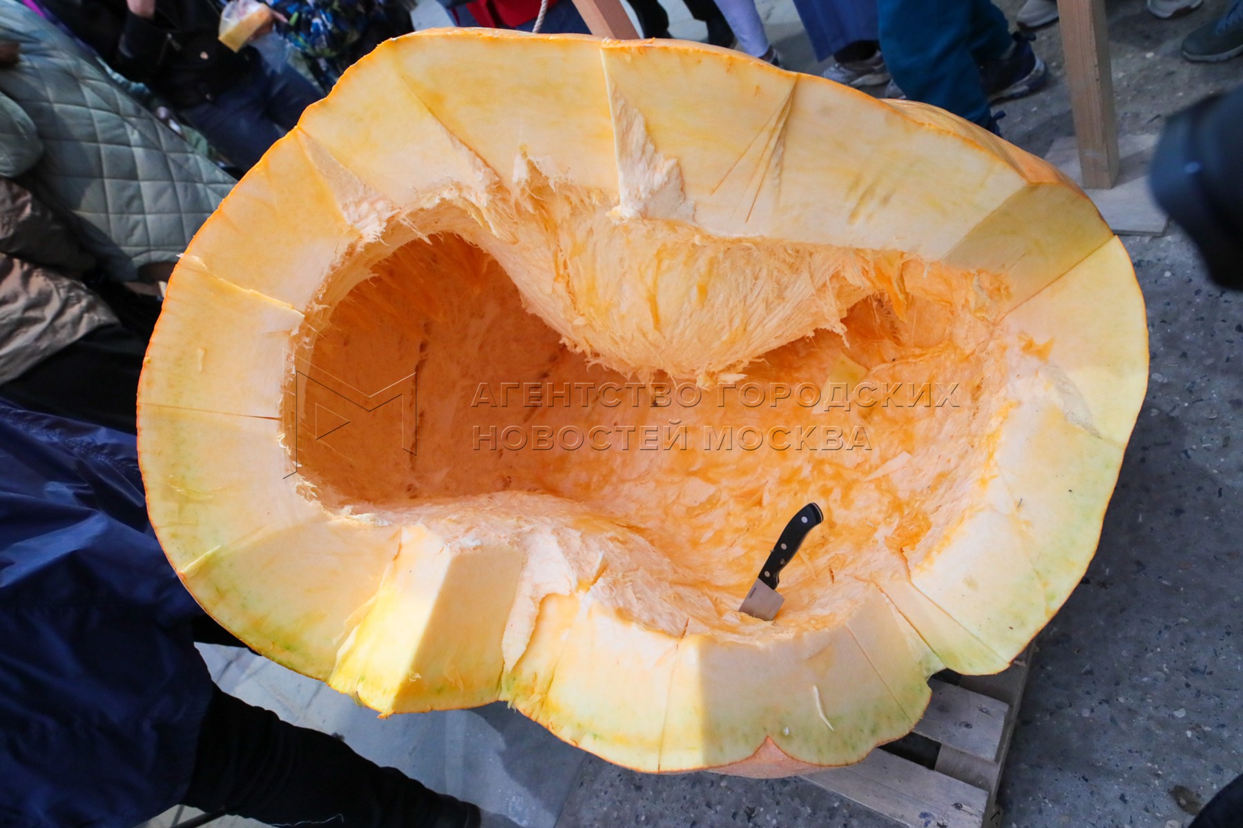 Торжественное вскрытие тыквы весом 389 кг в ботаническом саду МГУ «Аптекарский огород» в рамках выставки «Гигантский урожай России».