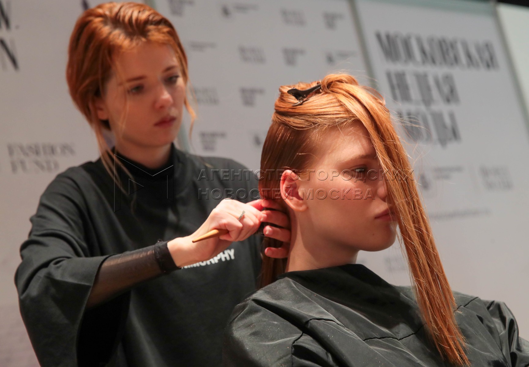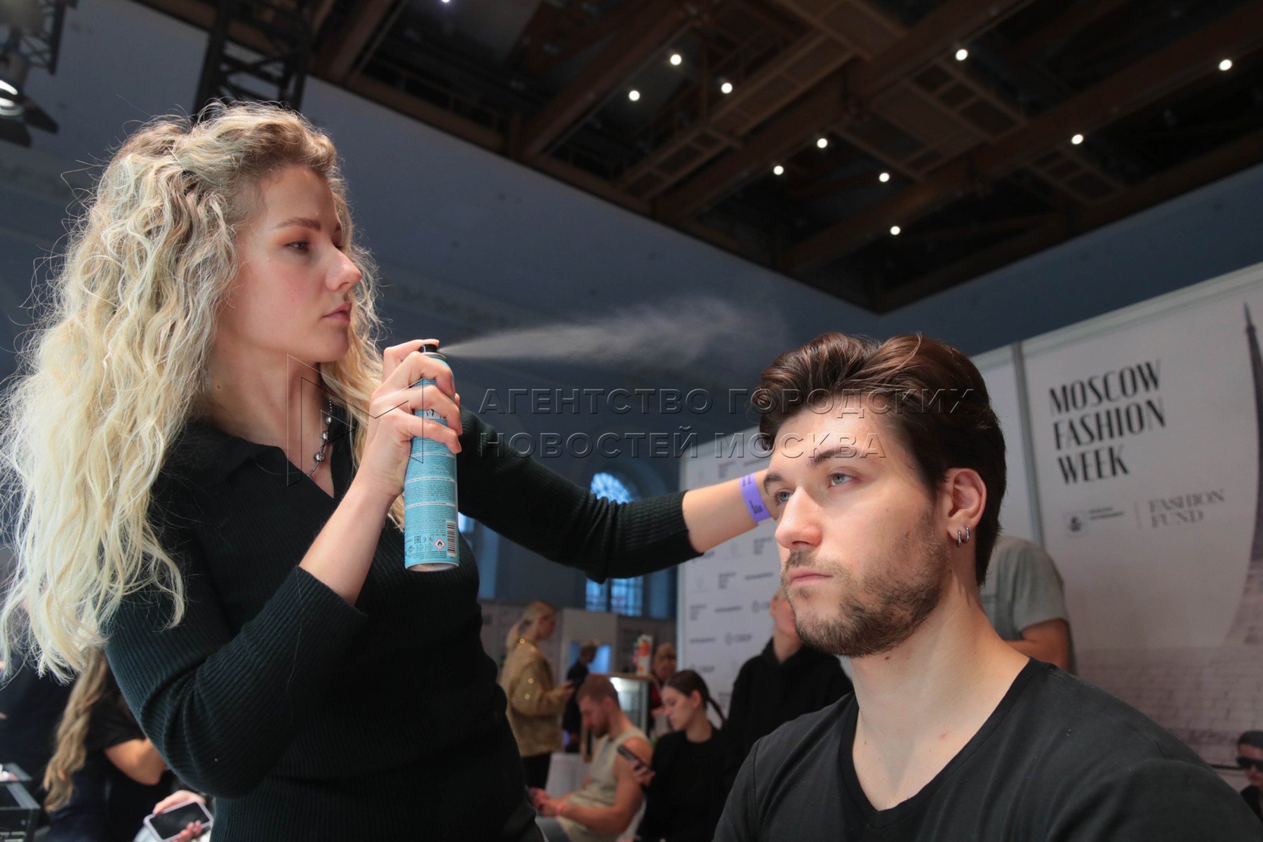 Подготовка модели перед началом показа. Московская неделя моды в центральном выст...