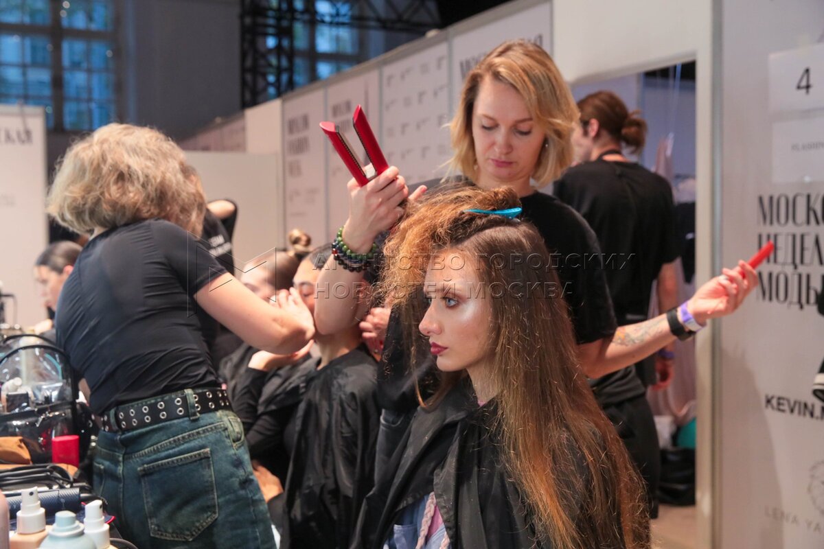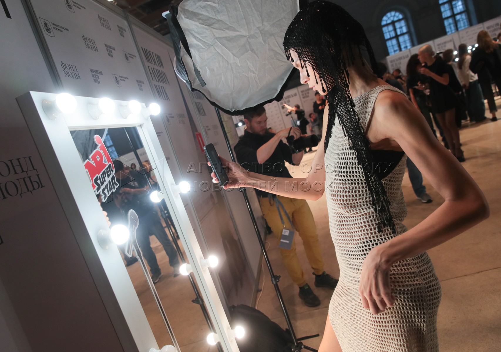Подготовка моделей перед началом показа. Московская неделя моды в центральном выс...