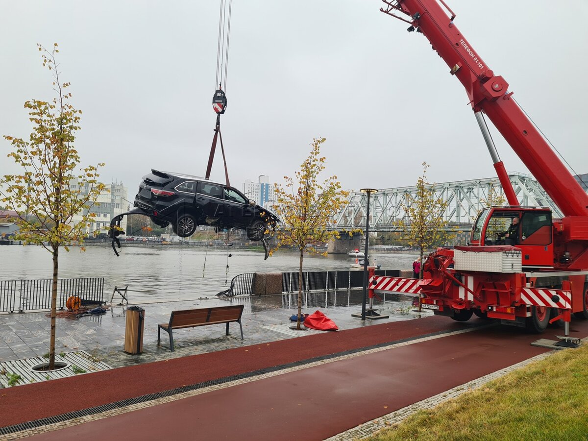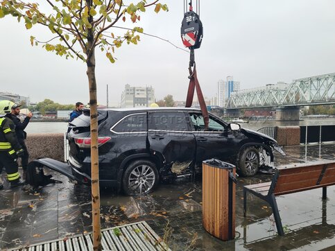 Извлечение легкового автомобиля из Москвы-реки после ДТП на набережной Марка Шагала