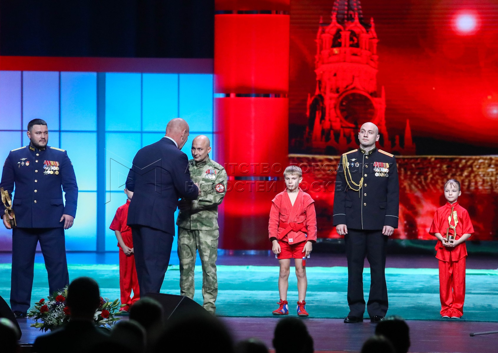 - Описание: Обладатель XV Национальной премии в области боевых искусств «Золотой пояс» в номинации «На службе отечеству» участник специальной военной операции Рамис Терегулов, член комитета Совета Федерации по международным делам, российский спортсмен, борец классического (греко-римского) стиля Александр Карелин, обладатель XV Национальной премии в области боевых искусств «Золотой пояс» в номинации «На службе отечеству» участник специальной военной операции Эдуард Шарафиев и обладатель XV Национальной премии в области боевых искусств «Золотой пояс» в номинации «На службе отечеству» участник специальной военной операции Михаил Подшибякин (слева направо). Церемония вручения XV Национальной премии Российского союза боевых искусств «Золотой пояс» на сцене Кремлевского дворца.