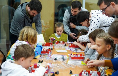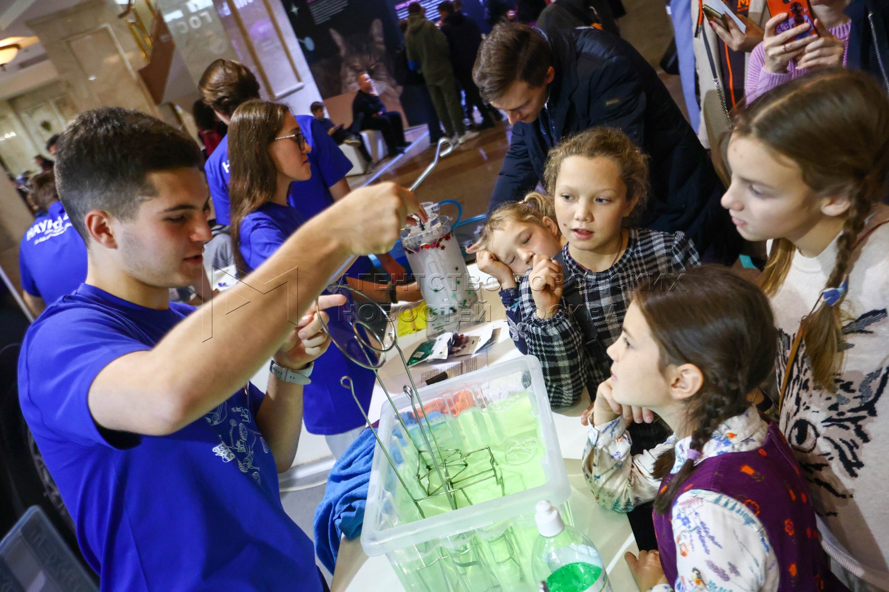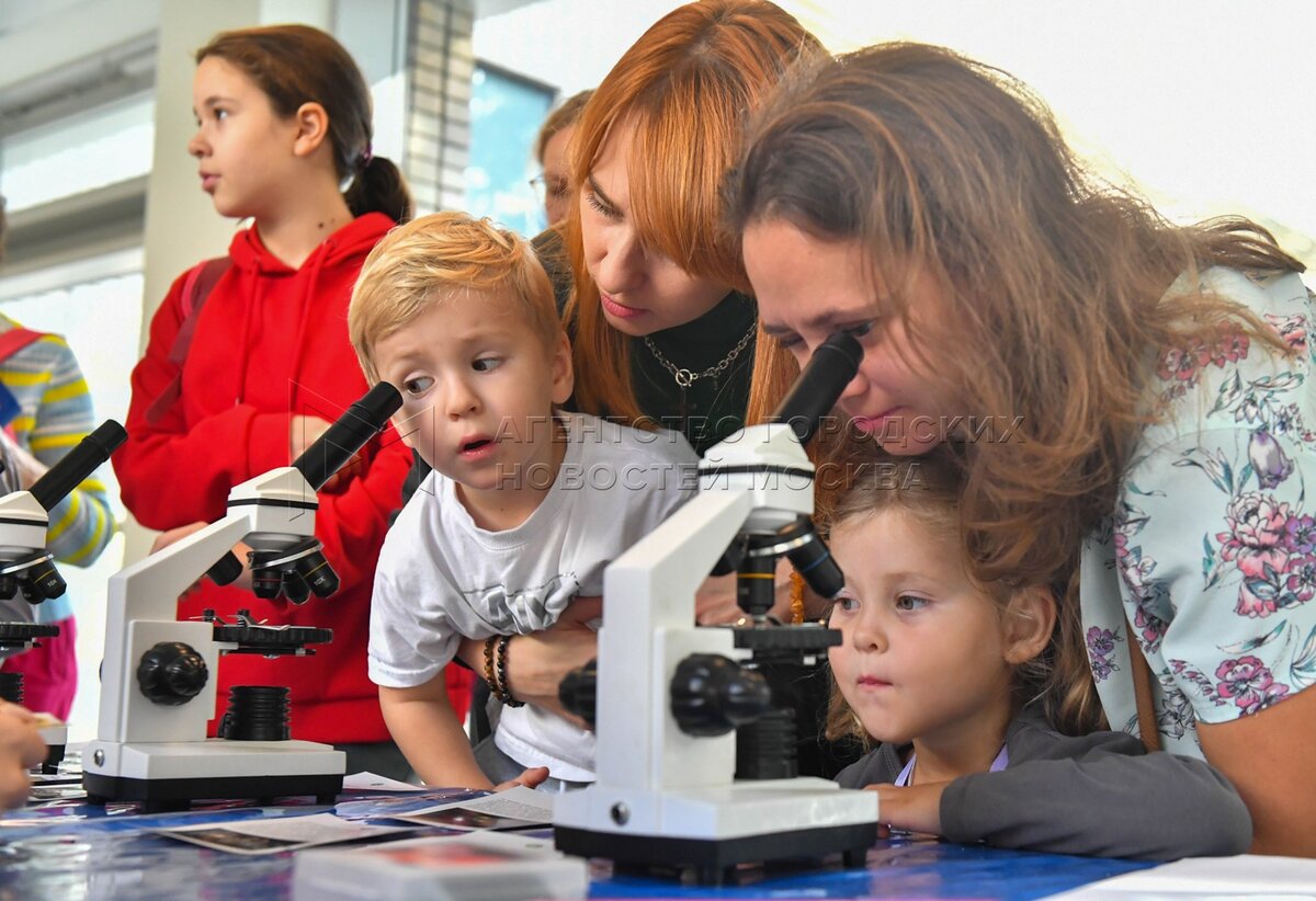 Дети смотрят в микроскоп. Открытие интерактивной научно-популярной выставки и «Де...