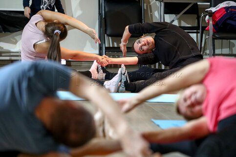 Упражнения по растяжке и общей физической подготовке для детей и взрослых в парке...