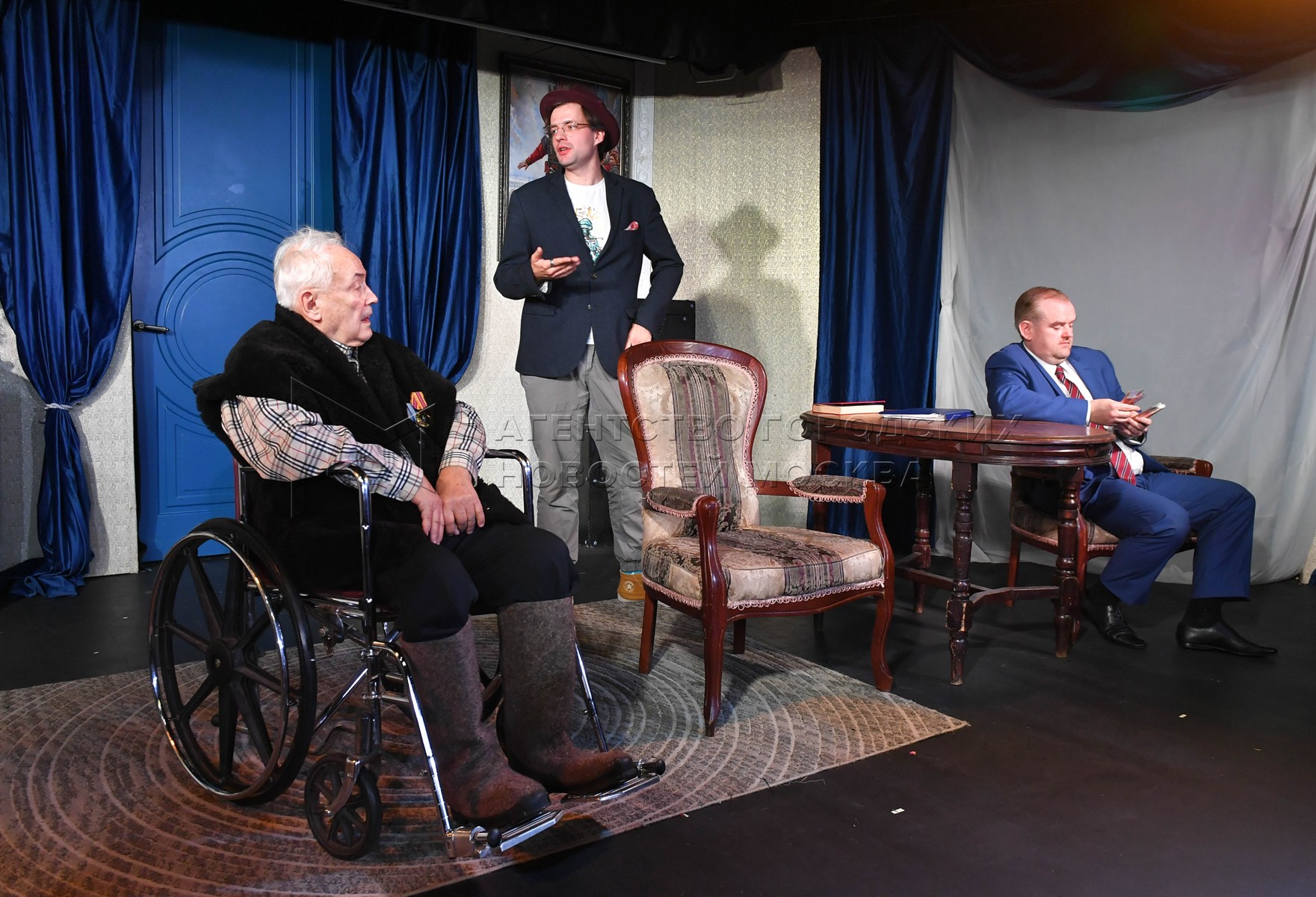 - Описание: Актеры Всеволод Шиловский в роли Петра Лукича Барабаша, Сергей Рожнов в роли Николая Карловича Турусова, полиглота и Александр Сибирцев в роли Марлена Петровича Барабаша (слева направо). Показ спектакля «Особняк на Рублевке» Московского театра-студии Всеволода Шиловского.