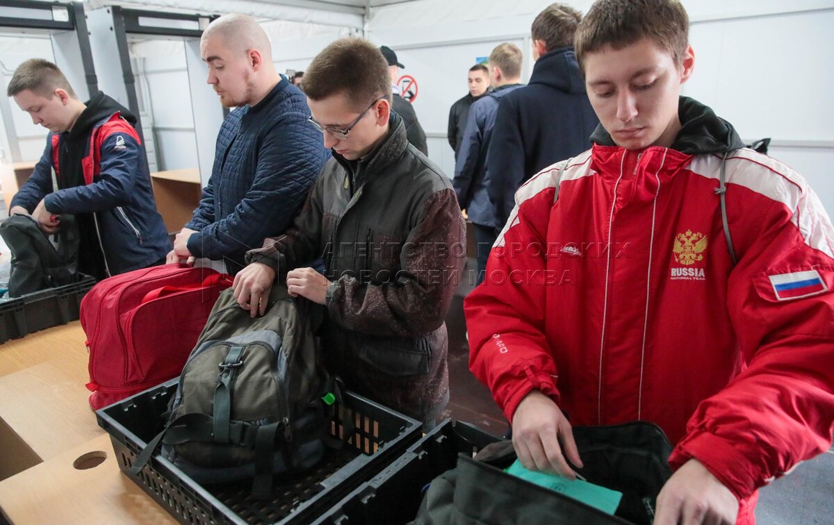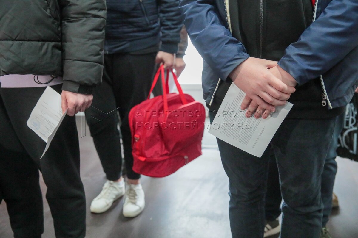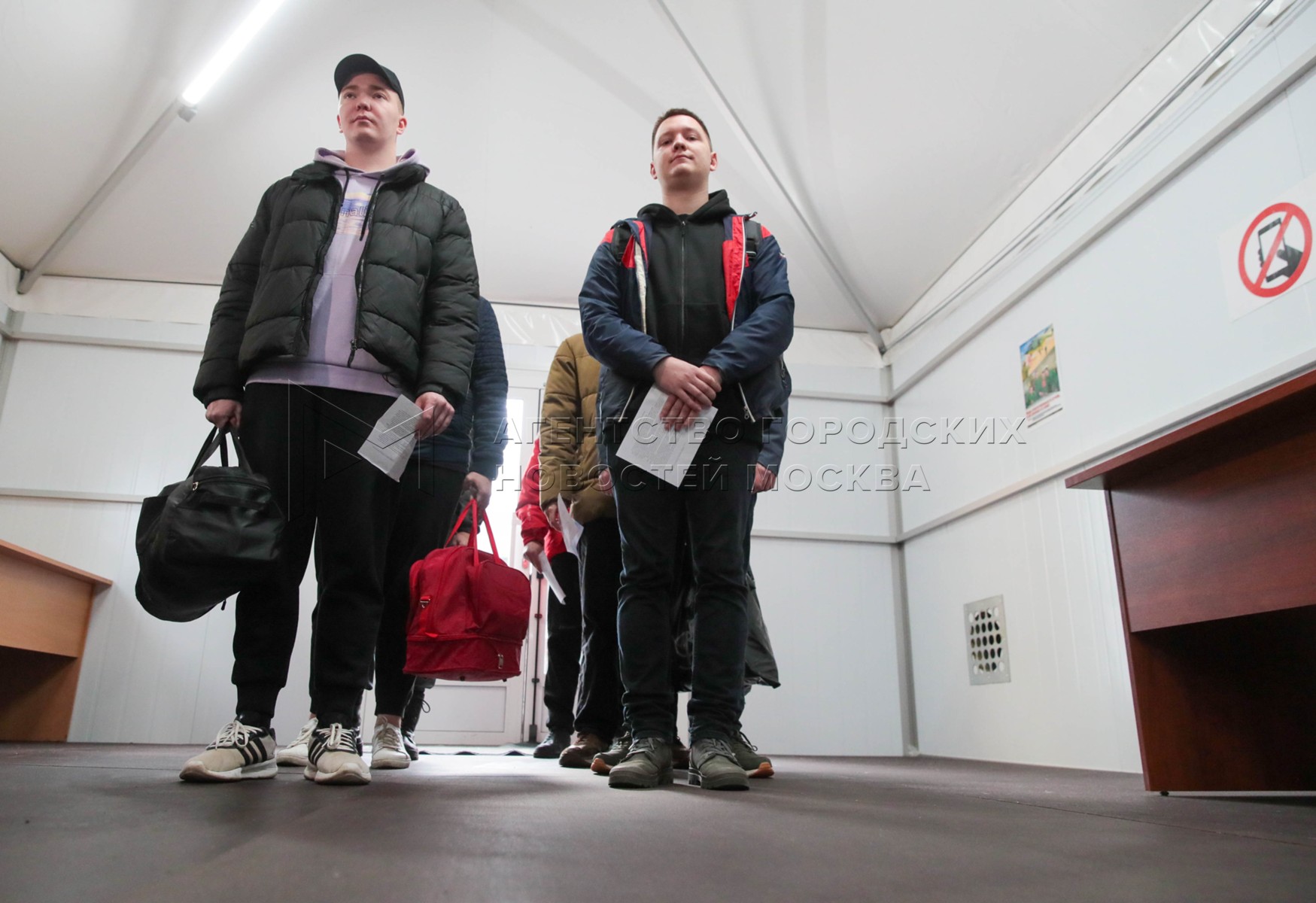 Отправка пополнения в рамках осенней призывной кампании Московского военного округа для прохождения службы по призыву в ВС РФ из числа граждан, проживающих в Москве, в городском сборном пункте.