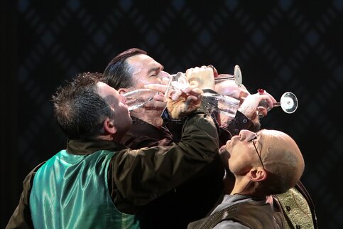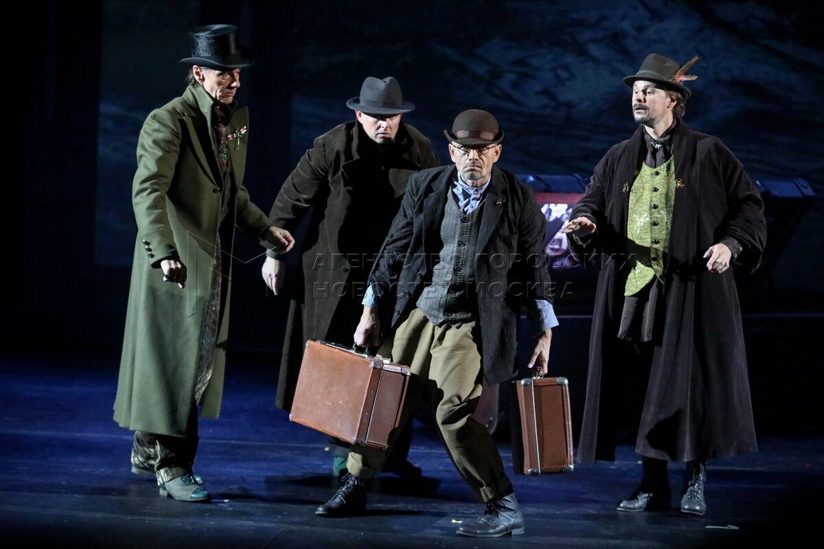 • Описание: Актеры Сергей Шнырев в роли Ихарева, Кирилл Анисимов в роли Кругеля, Юрий Васильев в роли Глова (старшего) и Игорь Лагутин в роли Швохнев​ (слева направо) в сцене из премьерного спектакля «Игроки» режиссера Альберта Хасиева по пьесе Николая Гоголя на основной сцене в Московском академическом театре сатиры.