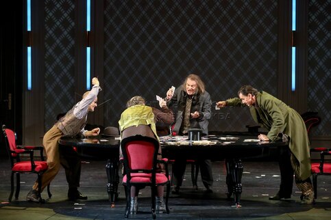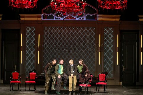 Актеры Сергей Шнырев в роли Ихарева, Кирилл Анисимов в роли Кругеля, Юрий Васильев в роли Глова (старшего) и Игорь Лагутин в роли Швохнев​ (слева направо) в сцене из премьерного спектакля «Игроки» режиссера Альберта Хасиева по пьесе Николая Гоголя на основной сцене в Московском академическом театре сатиры.