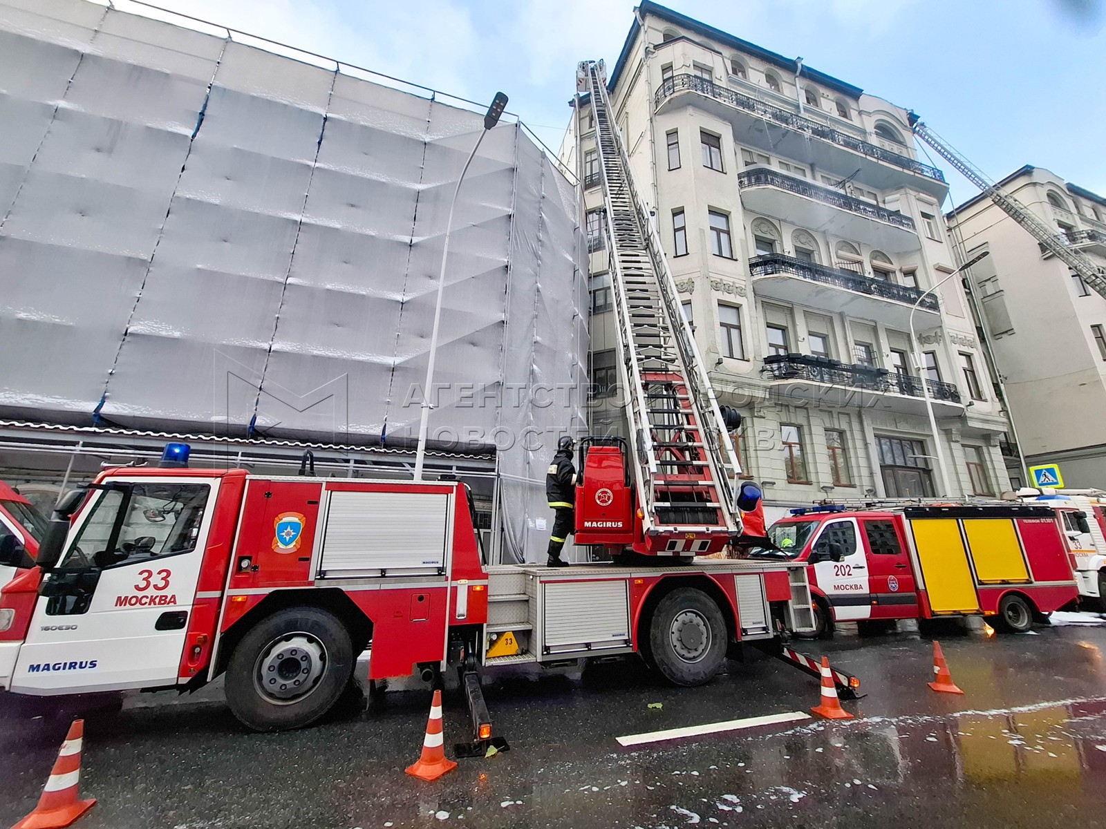 Оперативные службы на месте возгорания в жилом доме на Тверском бульваре, где заг...