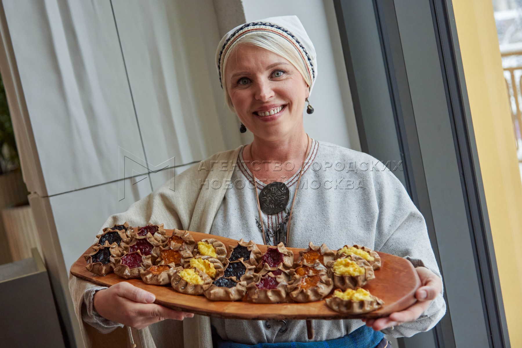 Участница фудхолла в национальном костюме и карельские пирожки калитки. Фудхолл «...