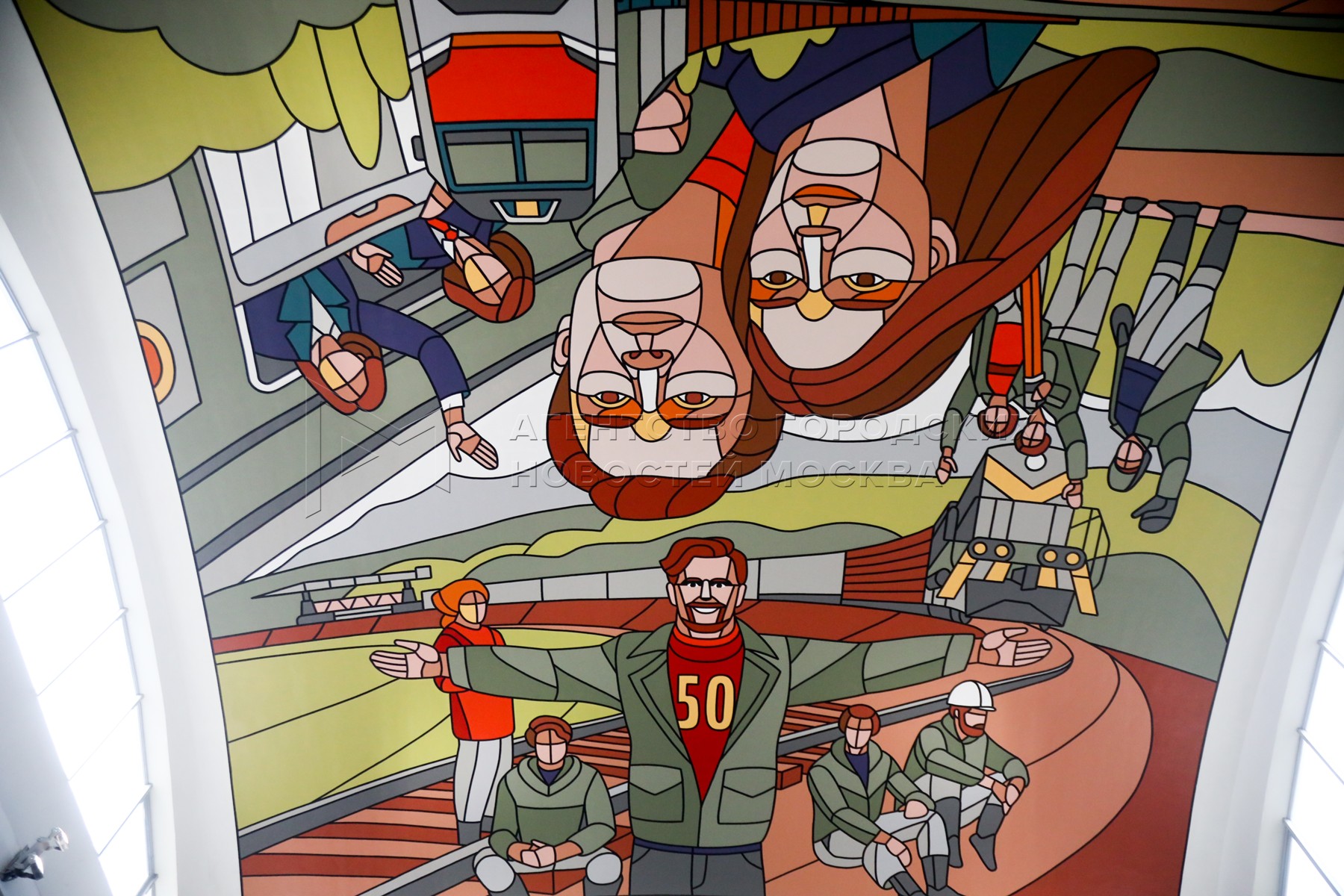 Презентация росписи художника Дмитрия Аске на Ярославском вокзале. Паблик-арт проект «Путь в завтра» создан к 50-летию с начала строительства Байкало-Амурской магистрали.