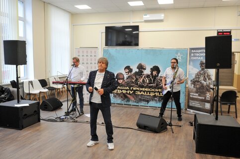 Заслуженный артист РФ Алексей Глызин посетил Единый пункт отбора на военную службу по контракту на ул. Яблочкова и дал концерт перед военнослужащими.
