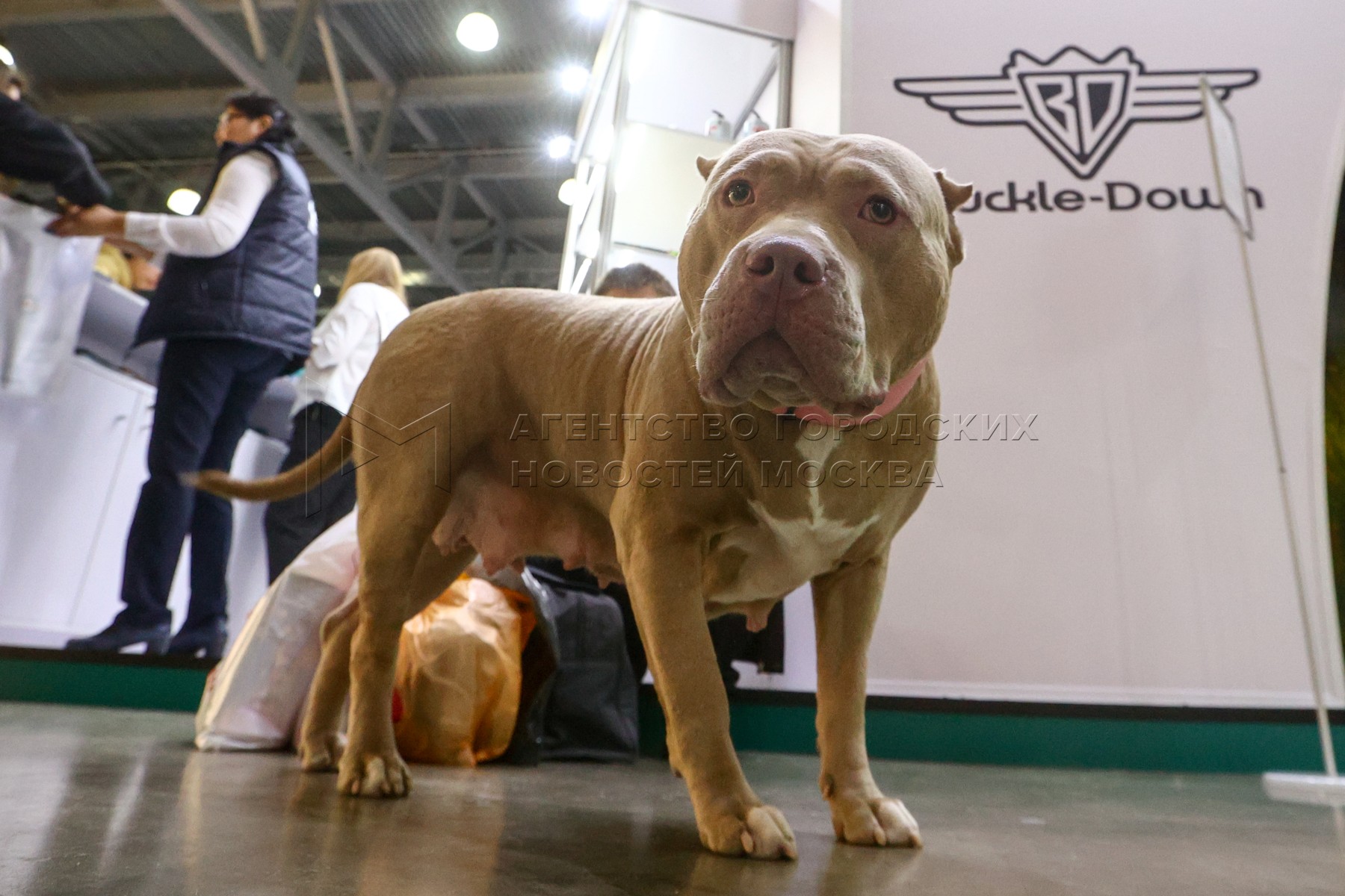 • Описание: Американский булли на выставке собак всех пород «Евразия. Кубок президента Российской кинологической федерации 2024» в Международном выставочном центре «Крокус Экспо».