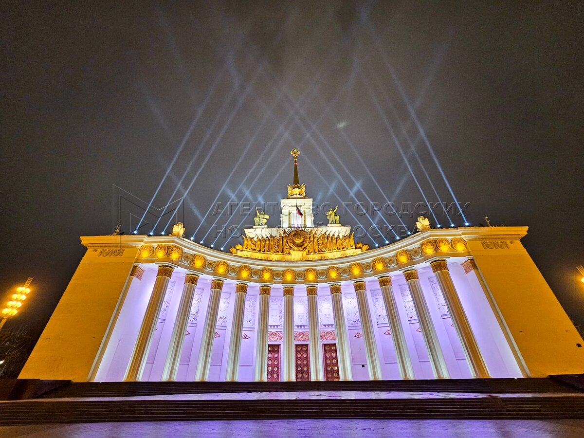Вечерняя подсветка павильона «Центральный» на ВДНХ.