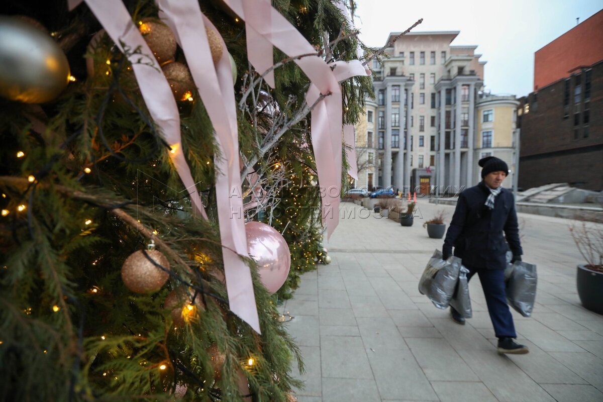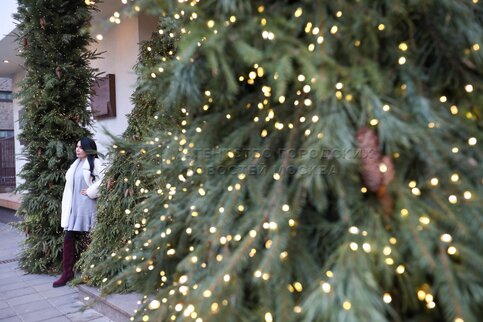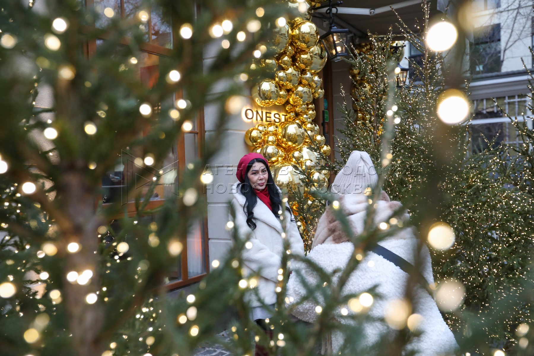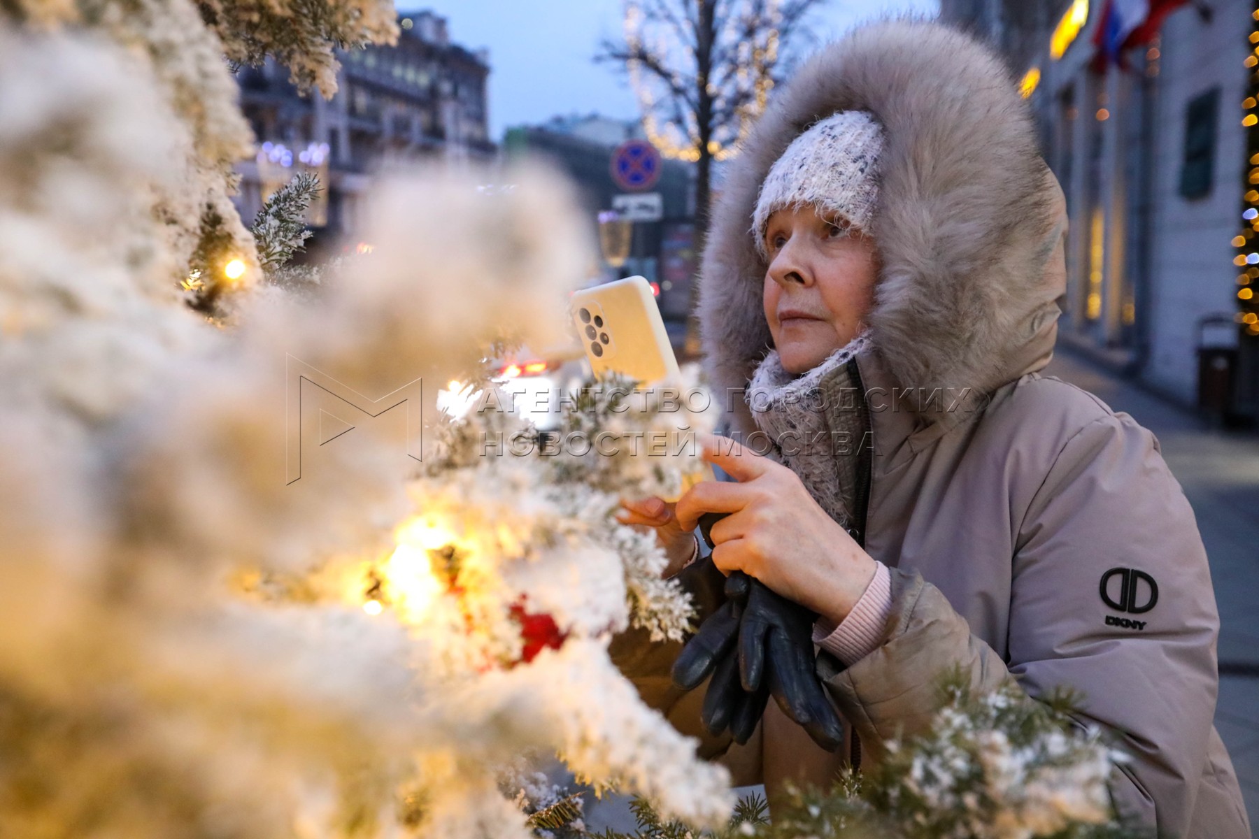 Горожанка возле Новогодней елки. Новогоднее оформление улиц Москвы.